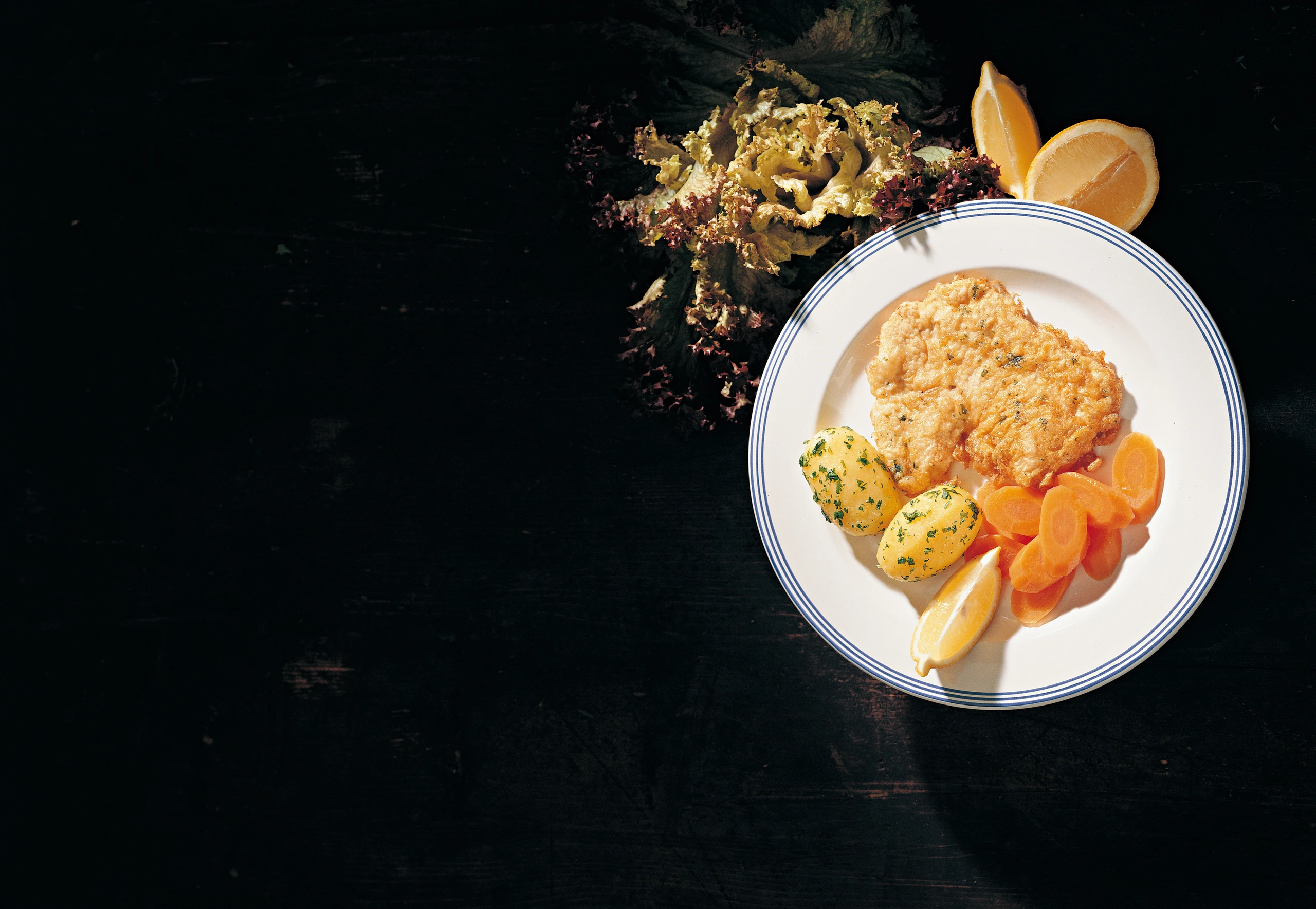 Fleisch aus der Pfanne heben und auf Küchenkrepp abtropfen lassen. Schnitzel mit Zitronenspalten garniert und Karottengemüse anrichten. Dazu passen auch Petersilerdäpfel.