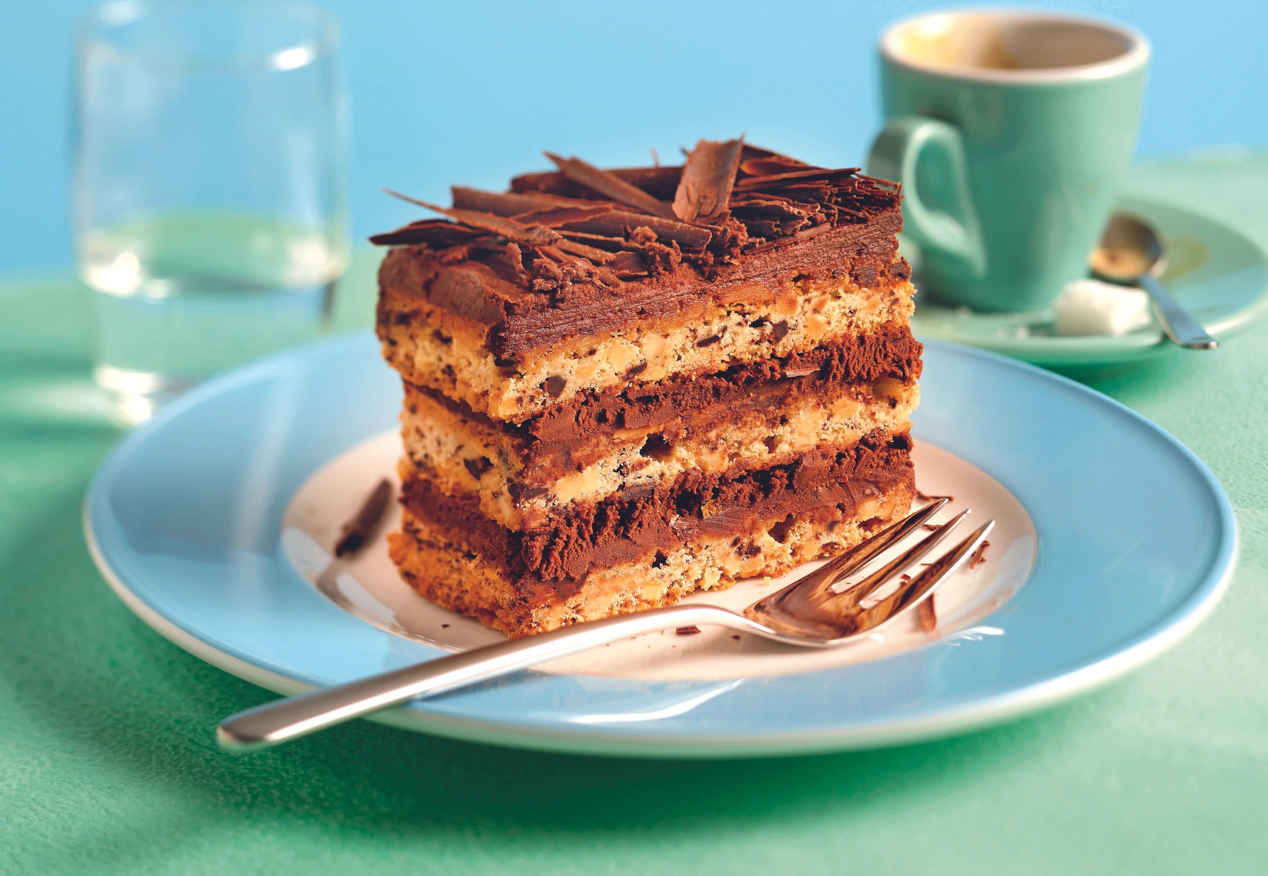 Creme kurz aufschlagen. Teigstreifen mit der Creme bestreichen, übereinandersetzen und leicht andrücken. Schnitte mit Kuvertüre garnieren.