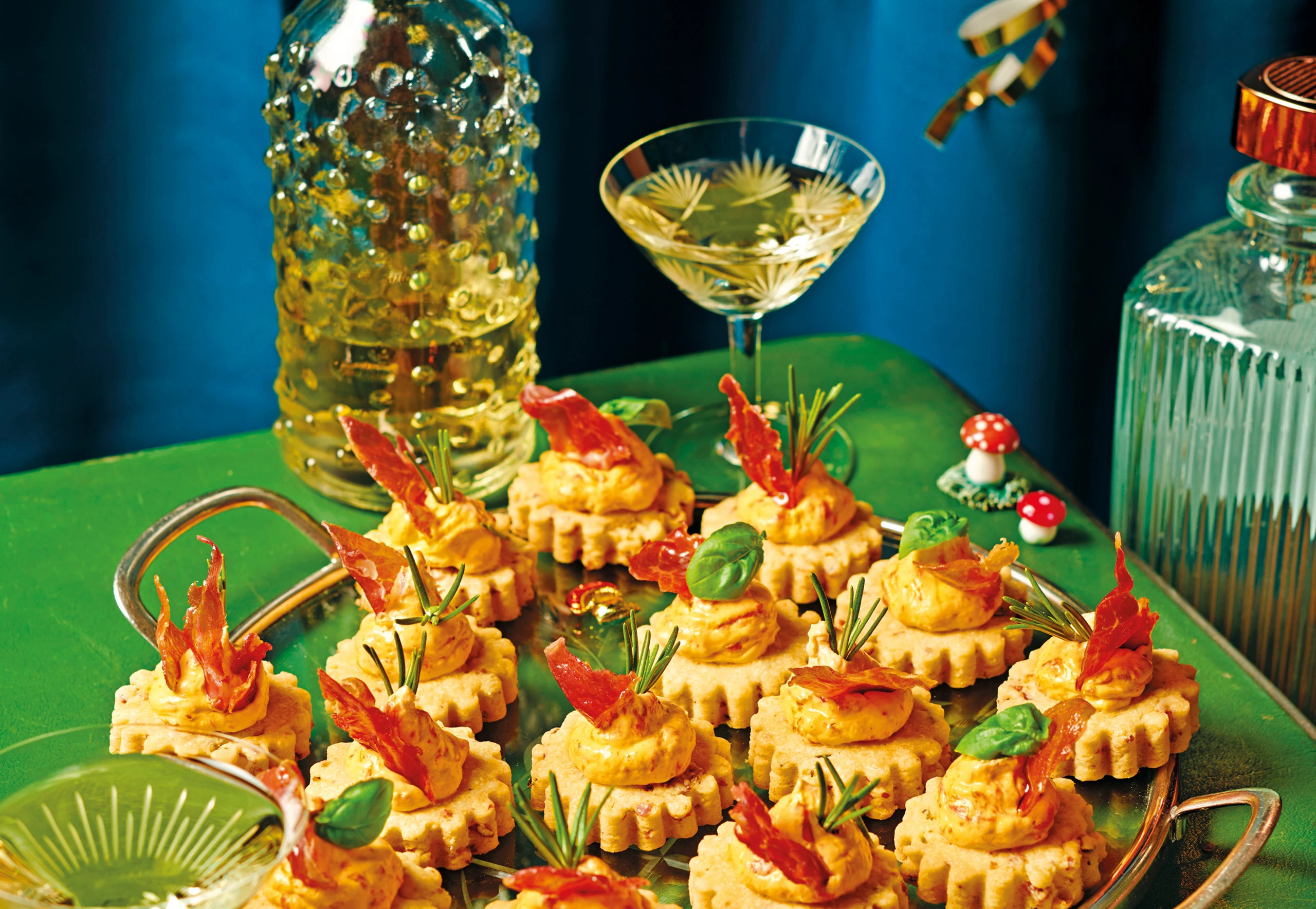 Creme in einen Dressiersack mit Lochtülle füllen und auf die Cracker dressieren. Übrigen Speck in Stücke brechen. Cracker mit Rosmarin, Basilikum und Speck dekorieren.