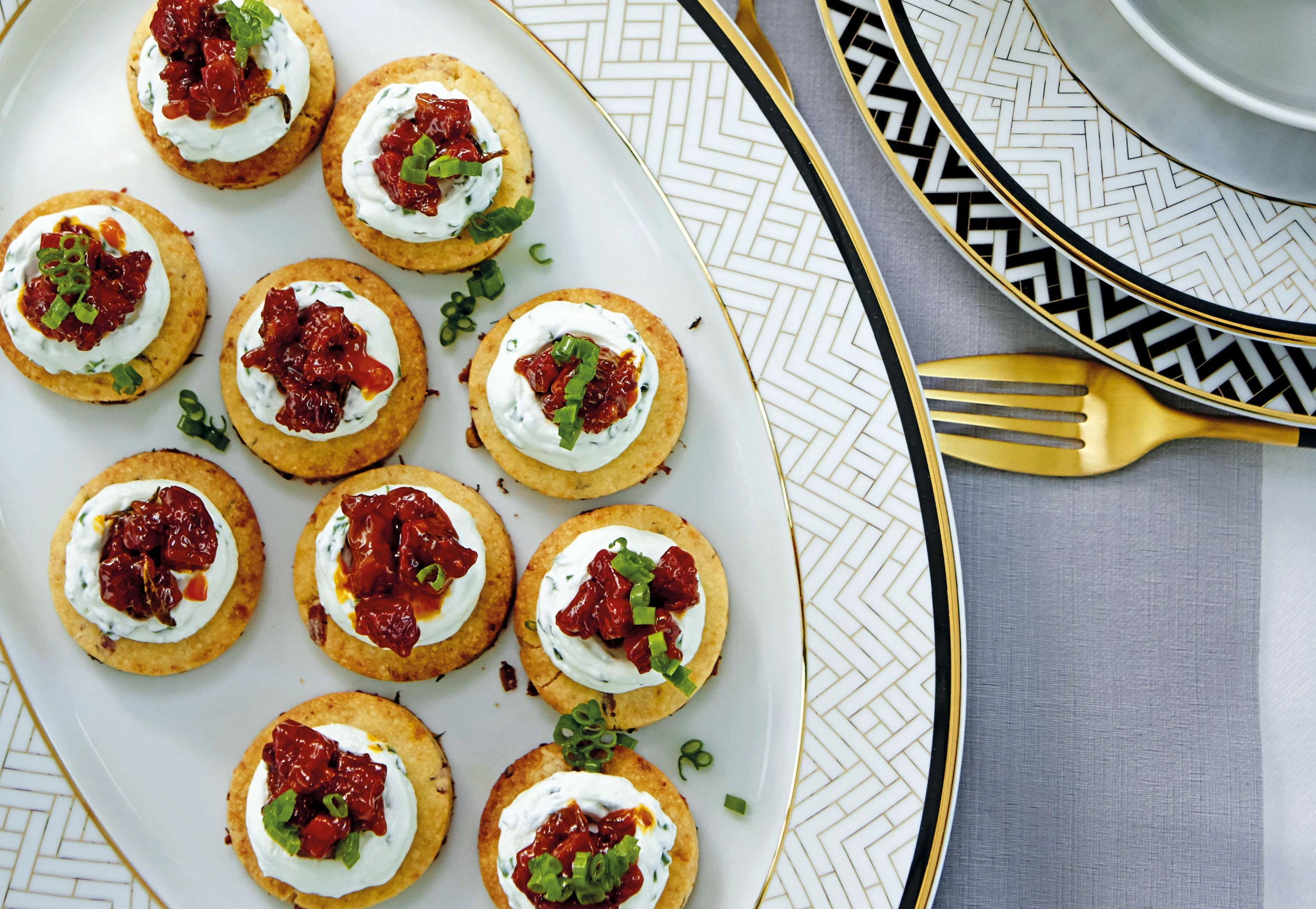 Frischkäse und 2 EL vom Schnittlauch verrühren, Tupfen auf den Talern verstreichen und mit einem Teelöffel kleine Mulden formen. Chorizo-Jam in den Mulden verteilen. Cracker mit restlichen Schnittlauchröllchen garniert servieren.