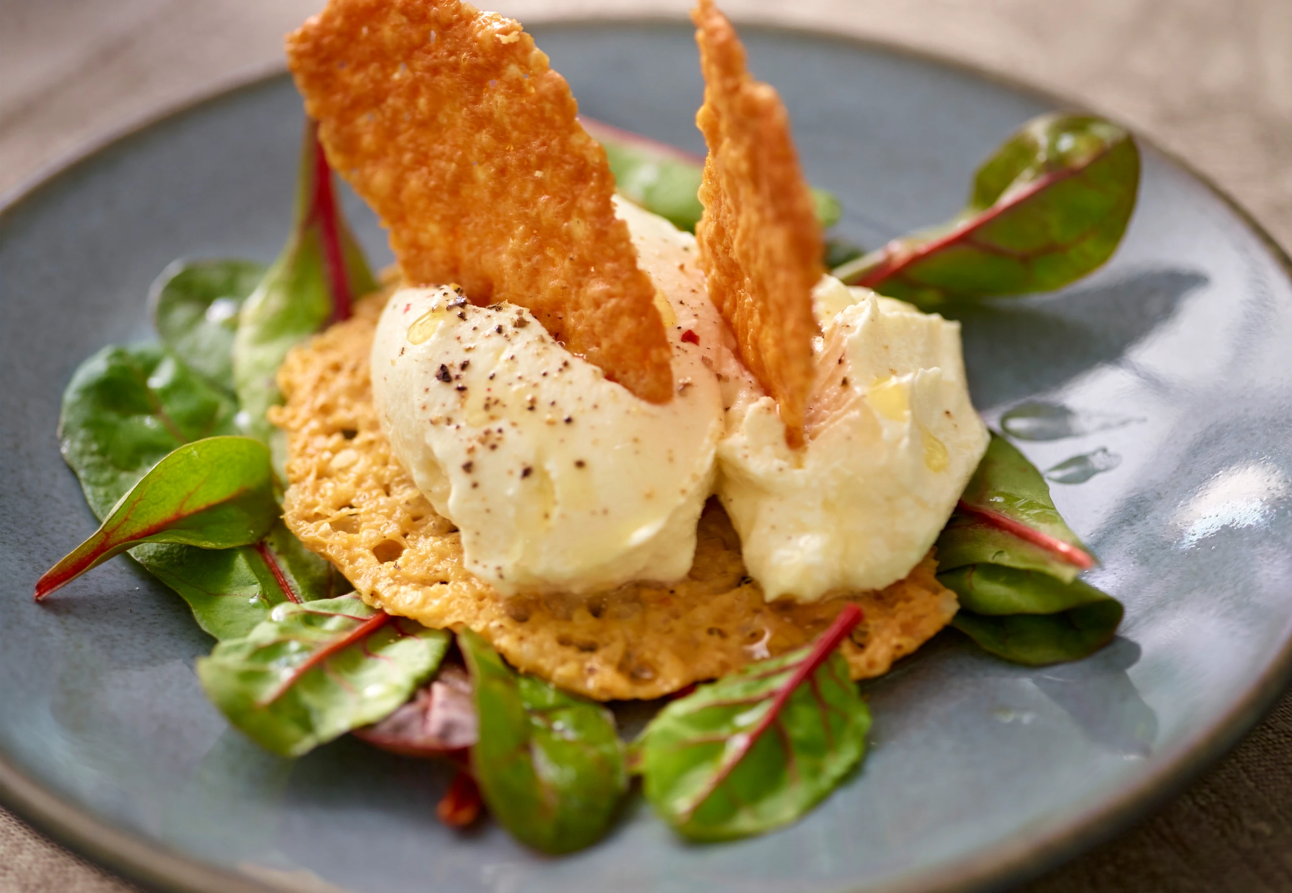 Salat portionieren, anrichten und mit je einer Käsescheibe belegen. Aus der Frischkäsemasse 8 Nockerln formen, je 2 davon auf eine Käsescheibe setzen. Übrige Käsescheiben vierteln. Frischkäse mit restlichem Öl beträufeln und mit Käsevierteln garnieren.