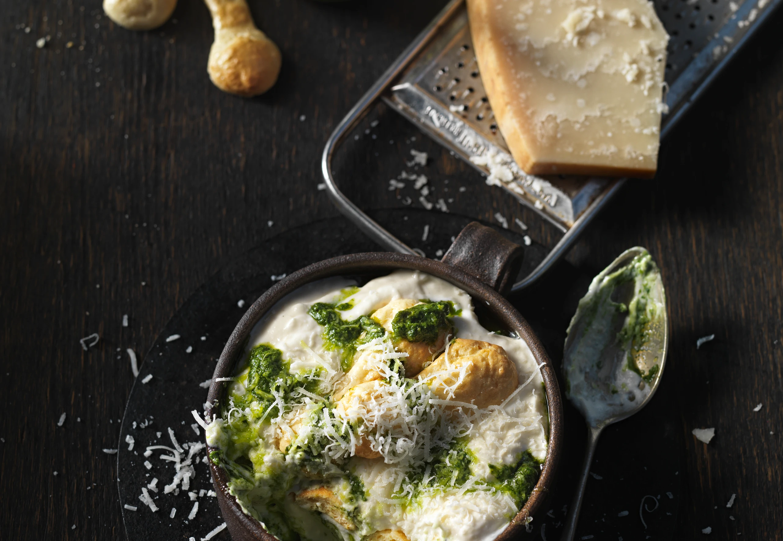 Für die Mascarponecreme Ei trennen. Dotter cremig rühren. Mascarpone und Parmesan untermischen. Eiklar mit wenig Salz zu Schnee schlagen, mit der Mascarponemasse vermischen. Creme mit Salz, Pfeffer und Zitronenschale abschmecken.