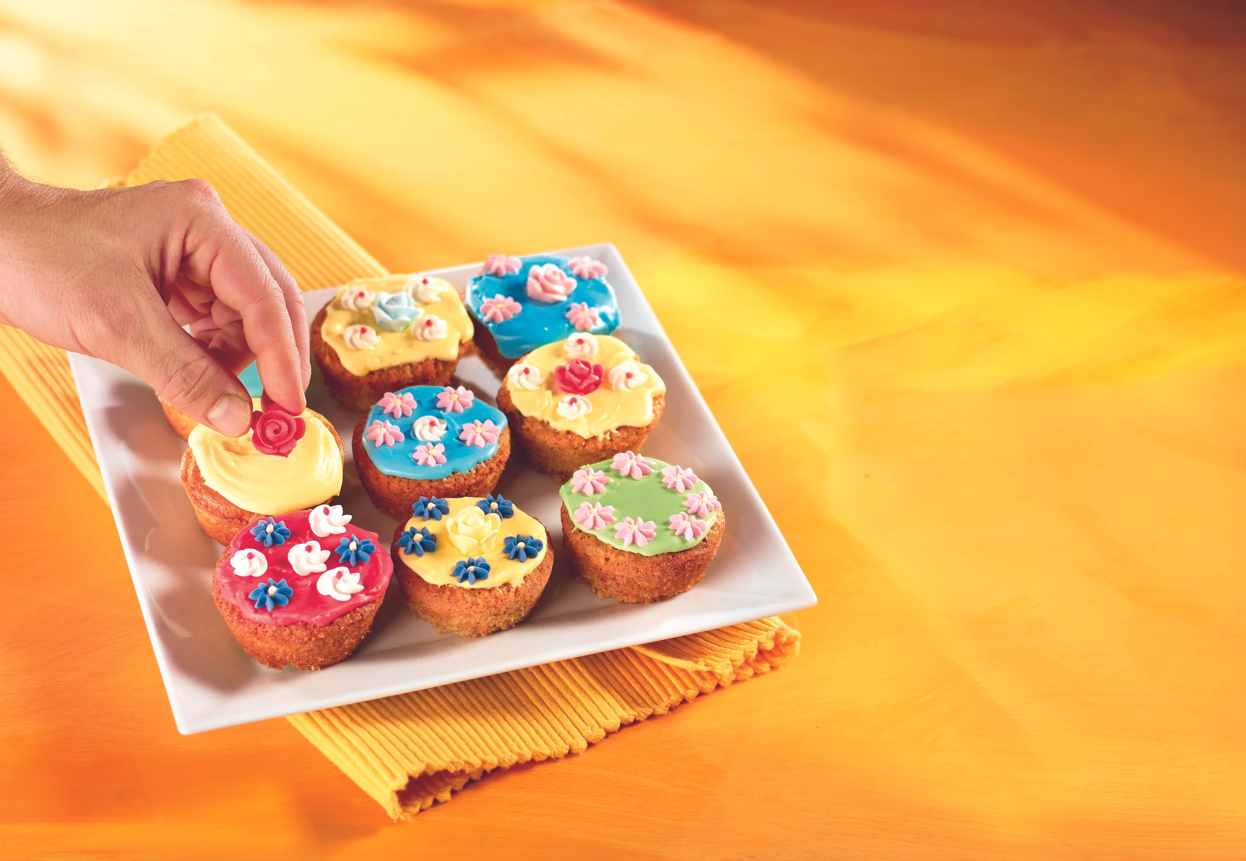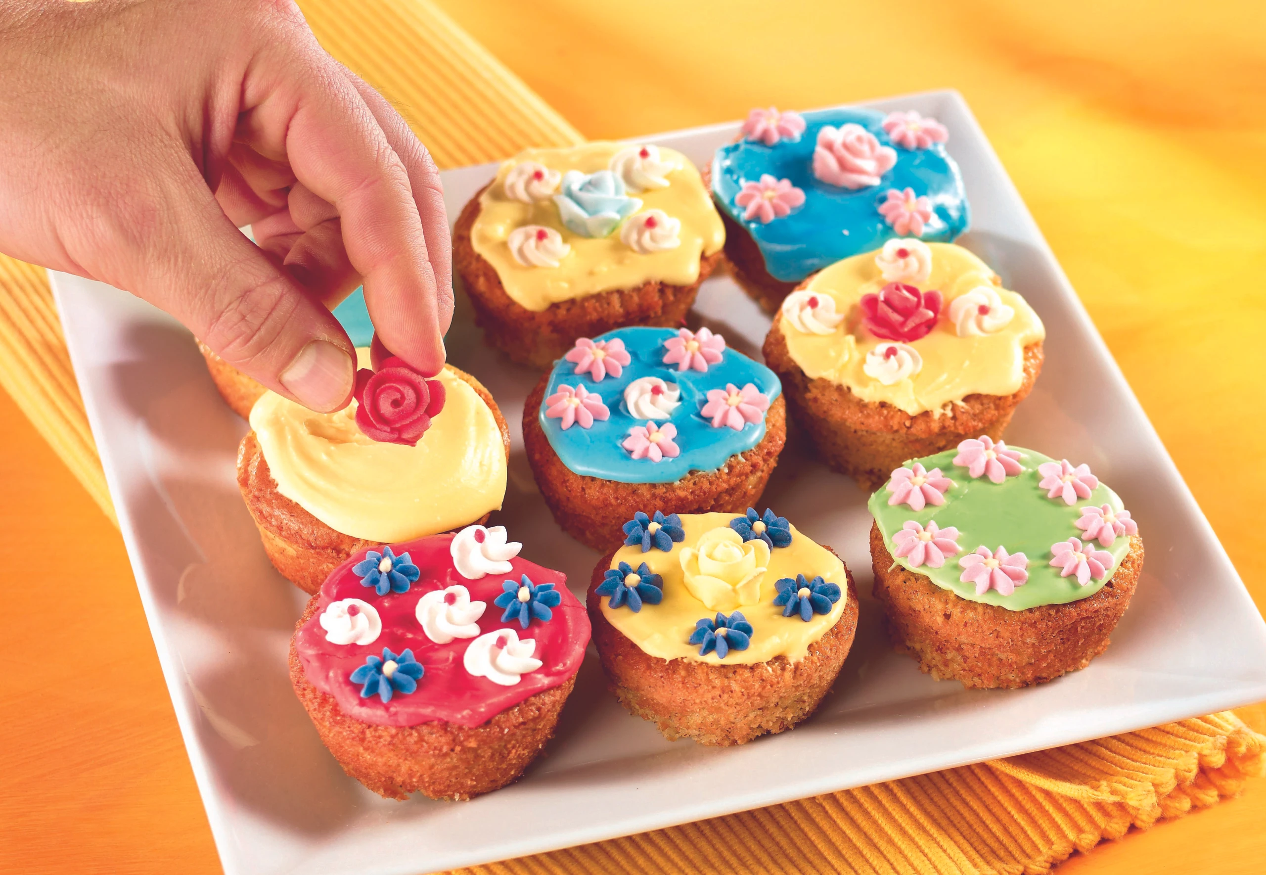 - Muffins aus den Förmchen nehmen. Glasur mit einem Löffel oder einer kleinen Gummispachtel auf den Muffins verteilen und mit Zuckerblumen garnieren. Oder Muffins mit Schokolade garnieren.