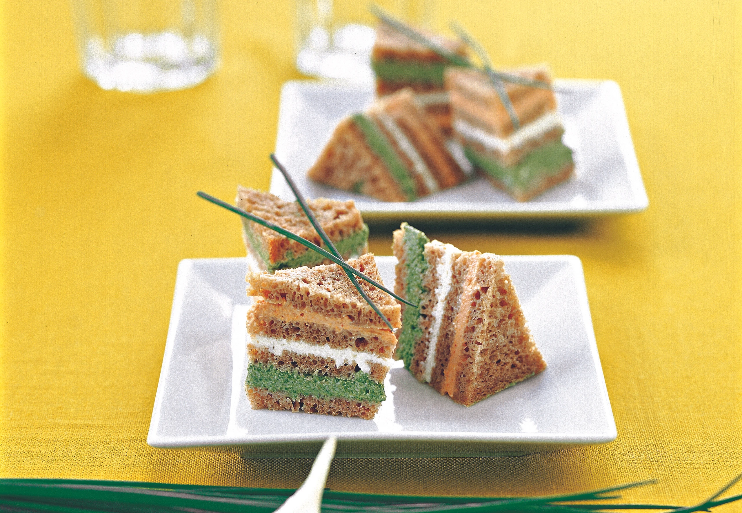 Je 2 Brotscheiben mit einer der Cremen bestreichen. Brote übereinander setzen und mit einer leeren Brotscheibe abschließen. Die Brote in Frischhaltefolie wickeln und ca. 1 Stunde kühlen. Schnittlauchhalme dritteln. Brote in Dreiecke schneiden und mit Schnittlauch garniert servieren.