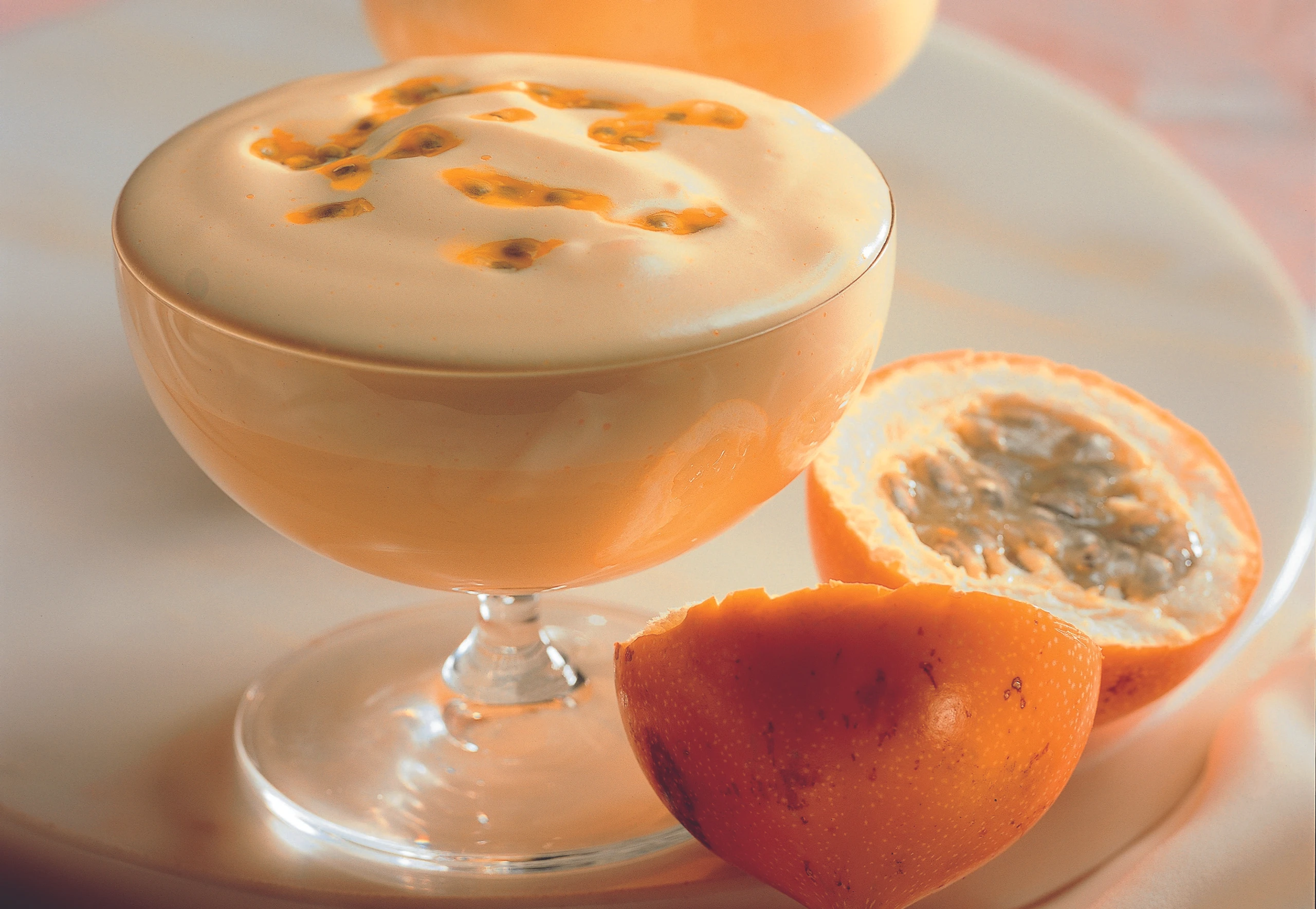 In einem Schneekessel den übrigen Passionsfruchtsaft mit Dottern, Zucker und Vanillezucker verrühren und über Dampf dick cremig aufschlagen – den Kessel dabei drehen und zügig schlagen, damit sich keine Klumpen bilden. Kessel vom Dampf nehmen und ins Eiswasser stellen. Masse weiterrühren, bis sie abgekühlt ist. Obers nicht zu steif schlagen und behutsam unterheben.