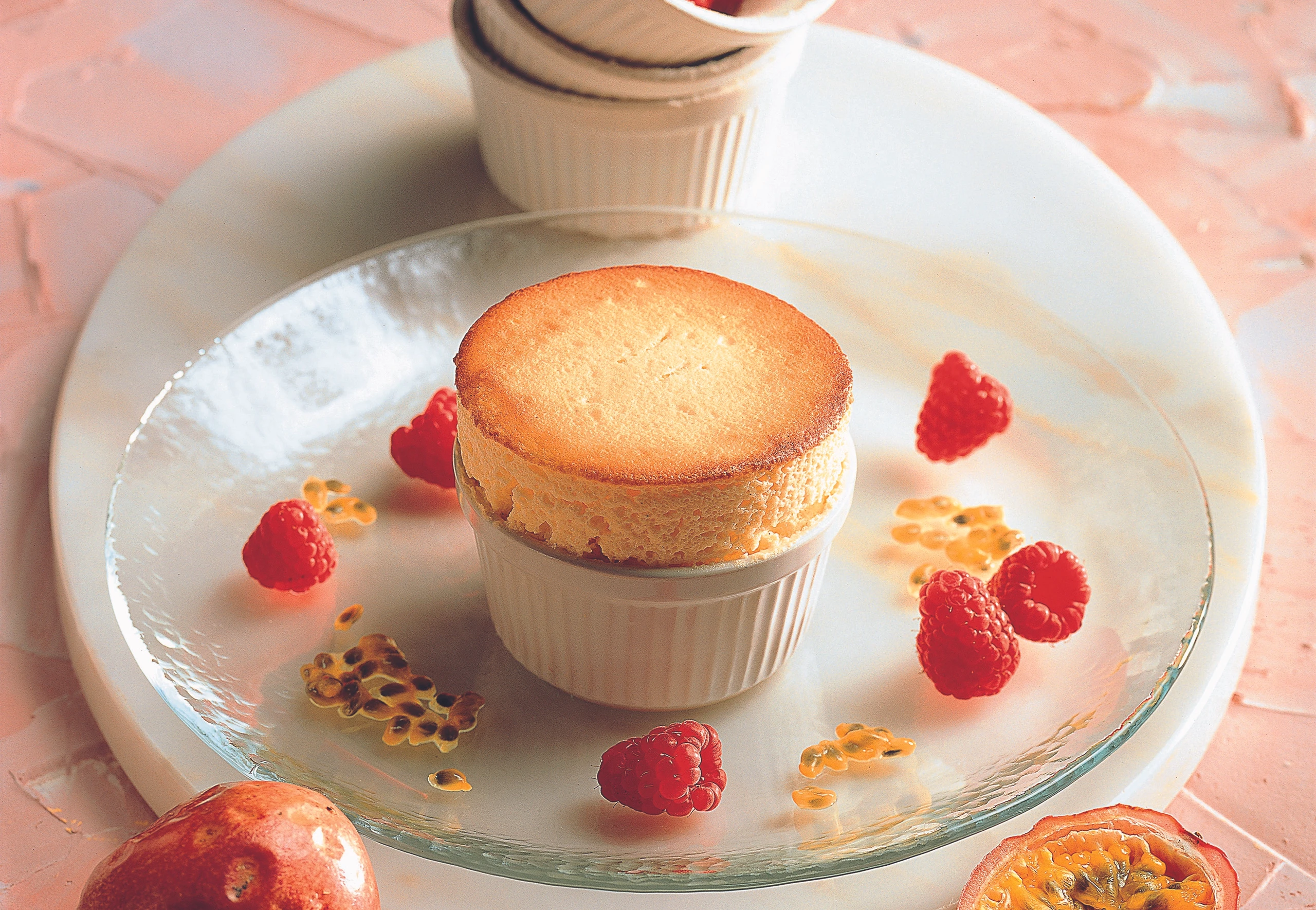 Passionsfrüchte für die Garnitur quer halbieren, das Fruchtfleisch herauslösen. Soufflés aus dem Rohr nehmen, mit Himbeeren und dem Fruchtfleisch garnieren und sofort – in den Förmchen – servieren.