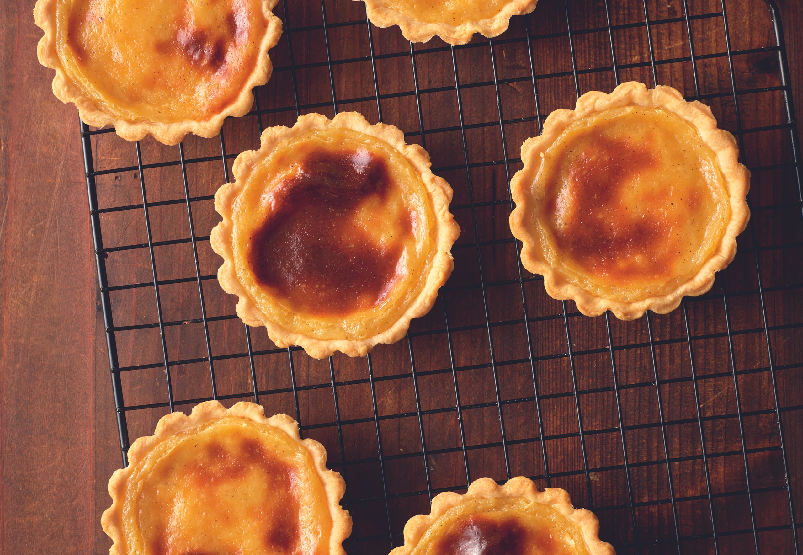 Teig aufrollen und 6 Scheiben (Ø ca. 11 cm) ausstechen. Teig in die Formen legen, Tartelettes damit auskleiden. Creme in einen Dressiersack mit Lochtülle (Ø 5 mm) geben und in die Tartelettes füllen. Im Rohr (mittlere Schiene / Gitterrost) 25–30 Minuten backen, bis die Creme zu bräunen beginnt.