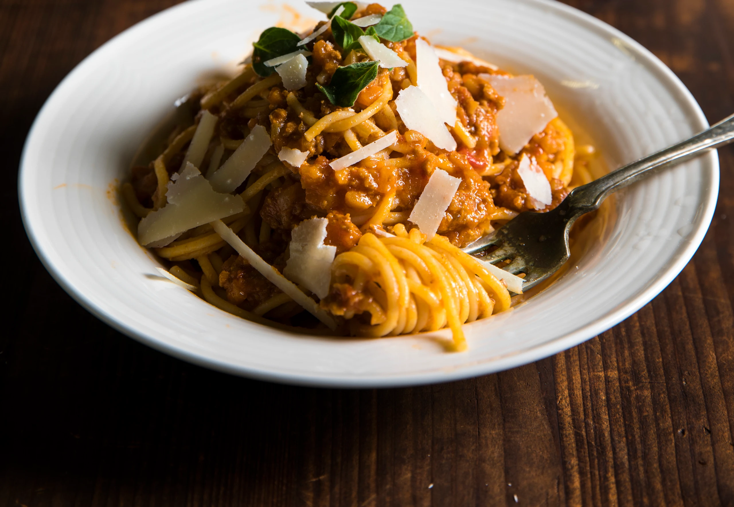 Spaghettini in Salzwasser bissfest kochen, abseihen und gut abtropfen lassen. Spaghettini mit der Sauce anrichten, mit Parmesan bestreuen und mit Oregano garniert servieren.