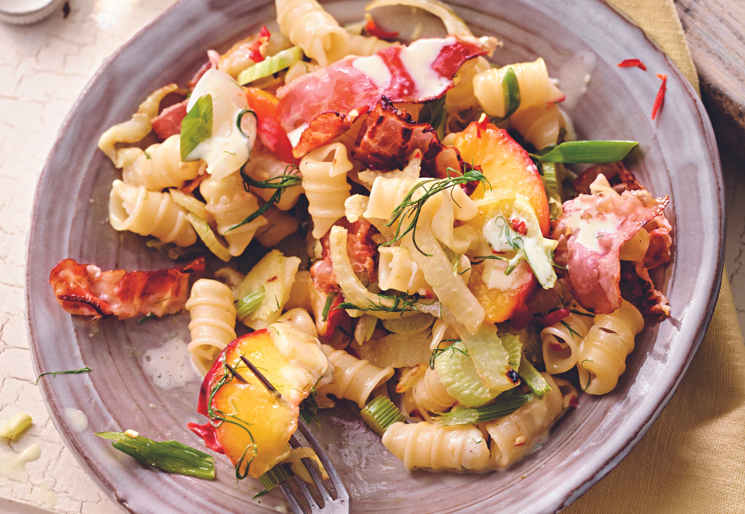 Pasta bissfest kochen, abseihen, abtropfen lassen, mit der Sauce vermischen und mit Pfirsich und Speck anrichten.