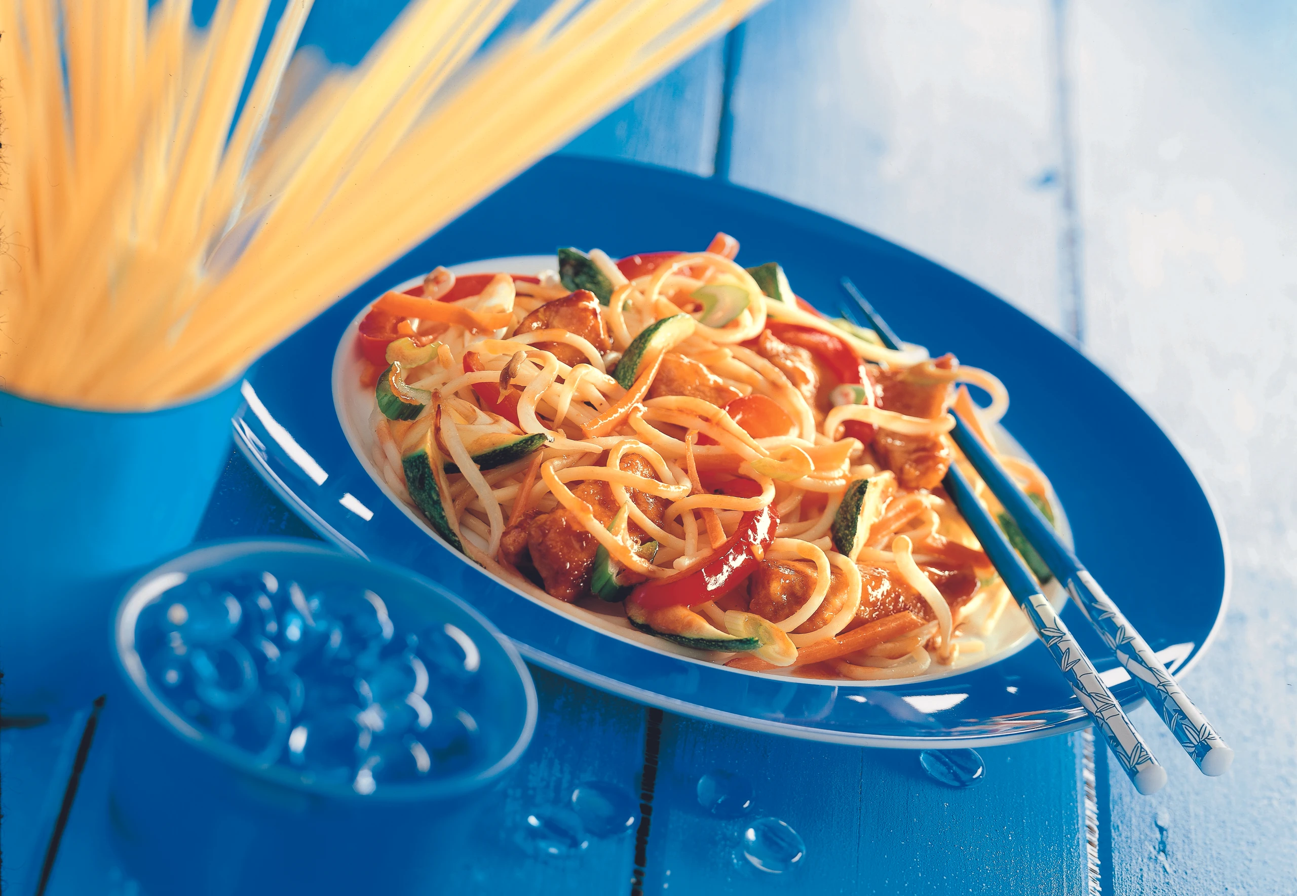 - Knoblauch, Karotten und Paprika in 1 EL Öl ca. 4 Minuten braten, mit Salz würzen. Zucchini und Sprossen zugeben und ca. 2 Minuten mitbraten. Nudeln und Fleisch zugeben, braten bis die Nudeln heiß sind.