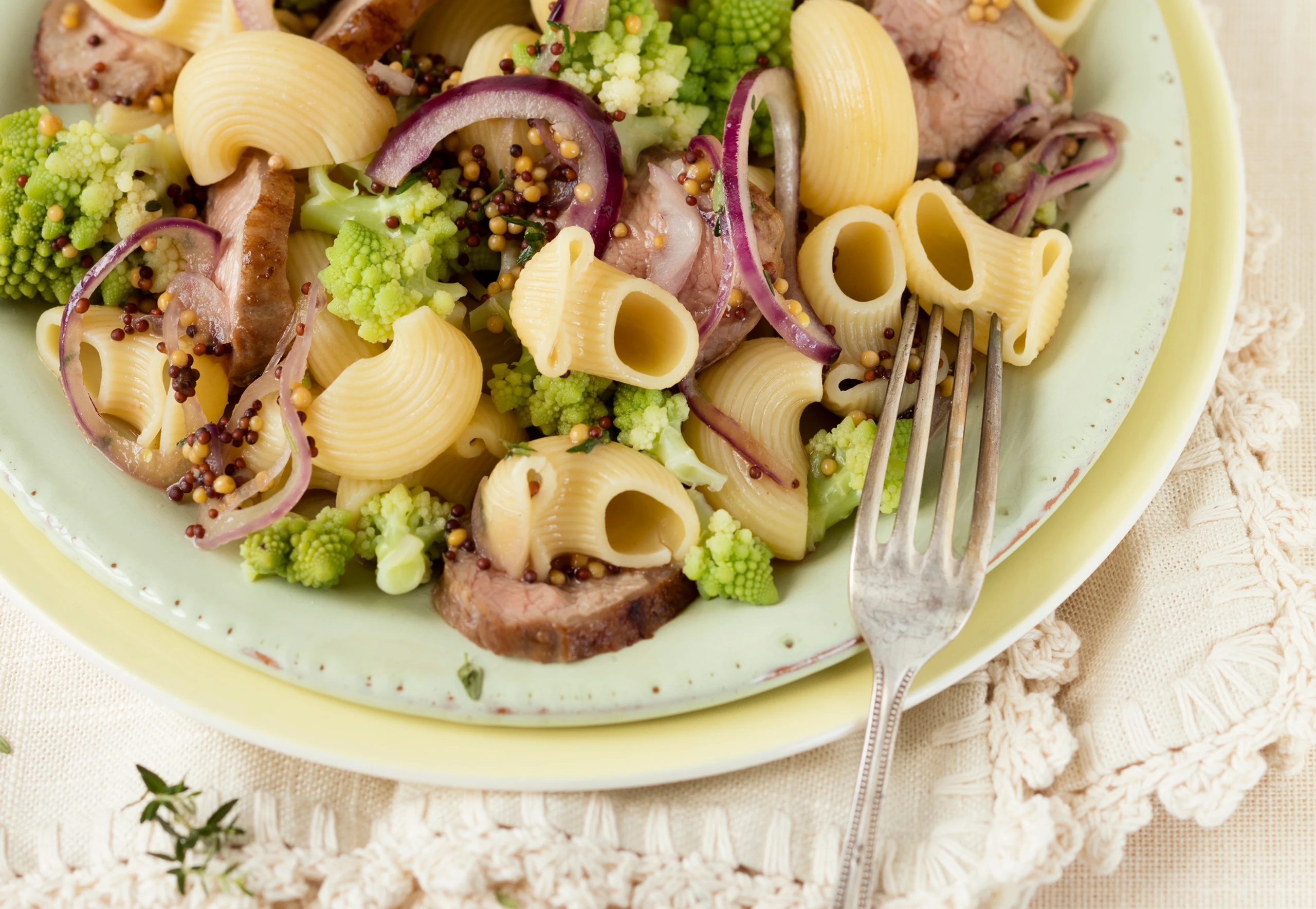 Parallel dazu Pasta in reichlich Salzwasser bissfest kochen. Gegen Ende der Garzeit Romanesco zugeben und mitgaren. Lammfilet quer in dünne Scheiben schneiden. Pastamischung abseihen, abtropfen lassen und mit Sauce und Lammfilet vermischen. Pasta anrichten.