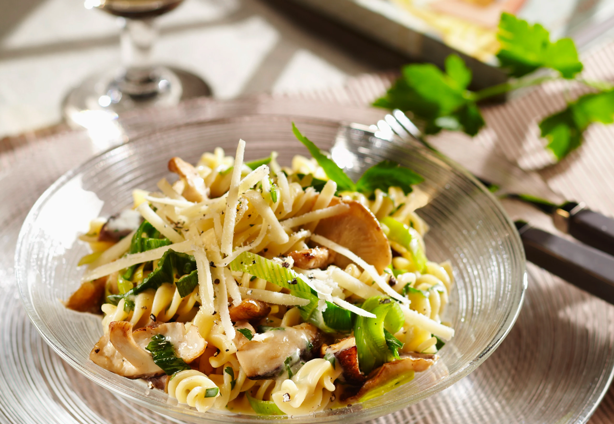 Fusilli in reichlich Salzwasser bissfest kochen. Lauch längs aufschneiden, waschen und quer in ca. 1 cm breite Stücke schneiden. Shiitake halbieren oder vierteln, beides in Öl anbraten und aus der Pfanne nehmen.