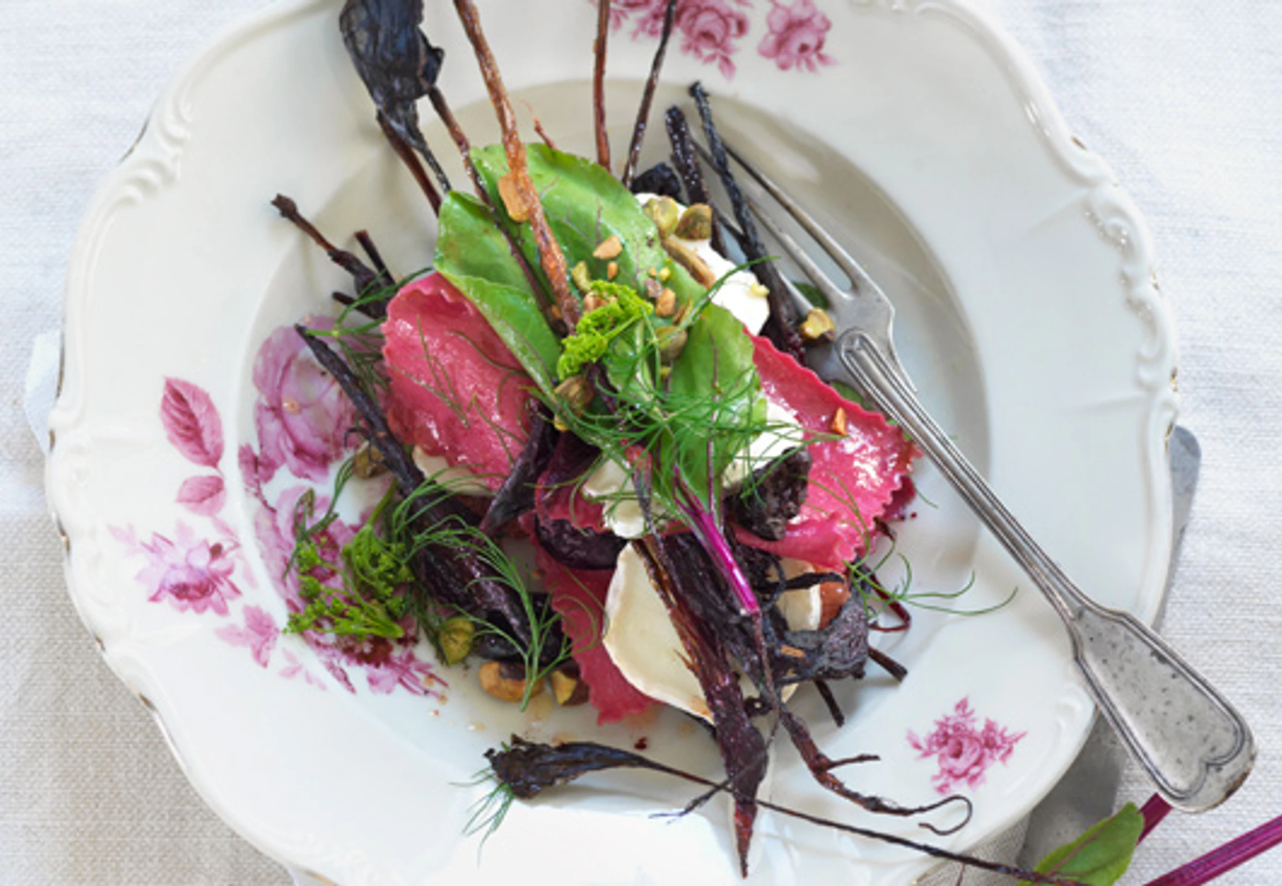 - Teigblätter abwechselnd mit Roten Rüben, Ziegenkäse, Grapefruit und Pistazien auf Teller schichten, mit den marinierten Blättern garnieren.