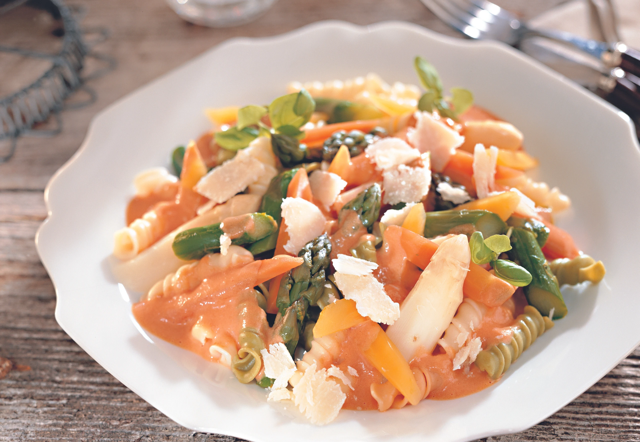 Nudeln in Salzwasser bissfest kochen, abseihen und kurz abspülen. In einem Topf Butter aufschäumen, Nudeln zugeben, mit Salz, Pfeffer, Cayennepfeffer und 1 Prise Muskat würzen. Spargelstücke, Karotten und Gelbe Rüben untermischen. Paradeissauce darüber gießen und nochmals kurz erhitzen.
