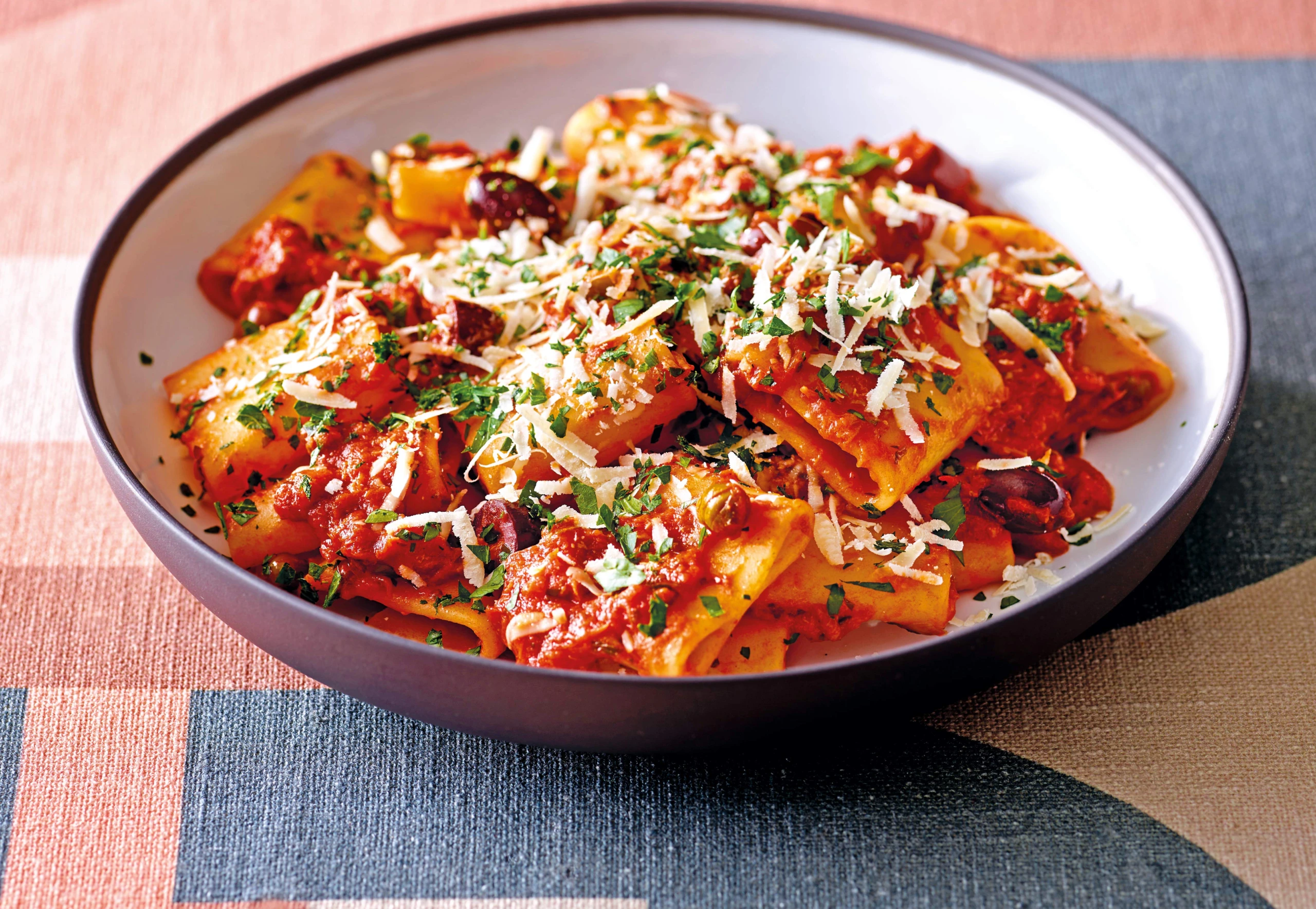 Thunfisch in einem Sieb abtropfen lassen. Mit Oliven und Kapern zu den Sardellen geben und kurz mit- braten, mit passierten Paradeisern aufgießen und mit Zimt würzen. Sauce ca. 30 Minuten bei geringer Hitze köcheln lassen, bis sie etwas eindickt. Gelegentlich umrühren.