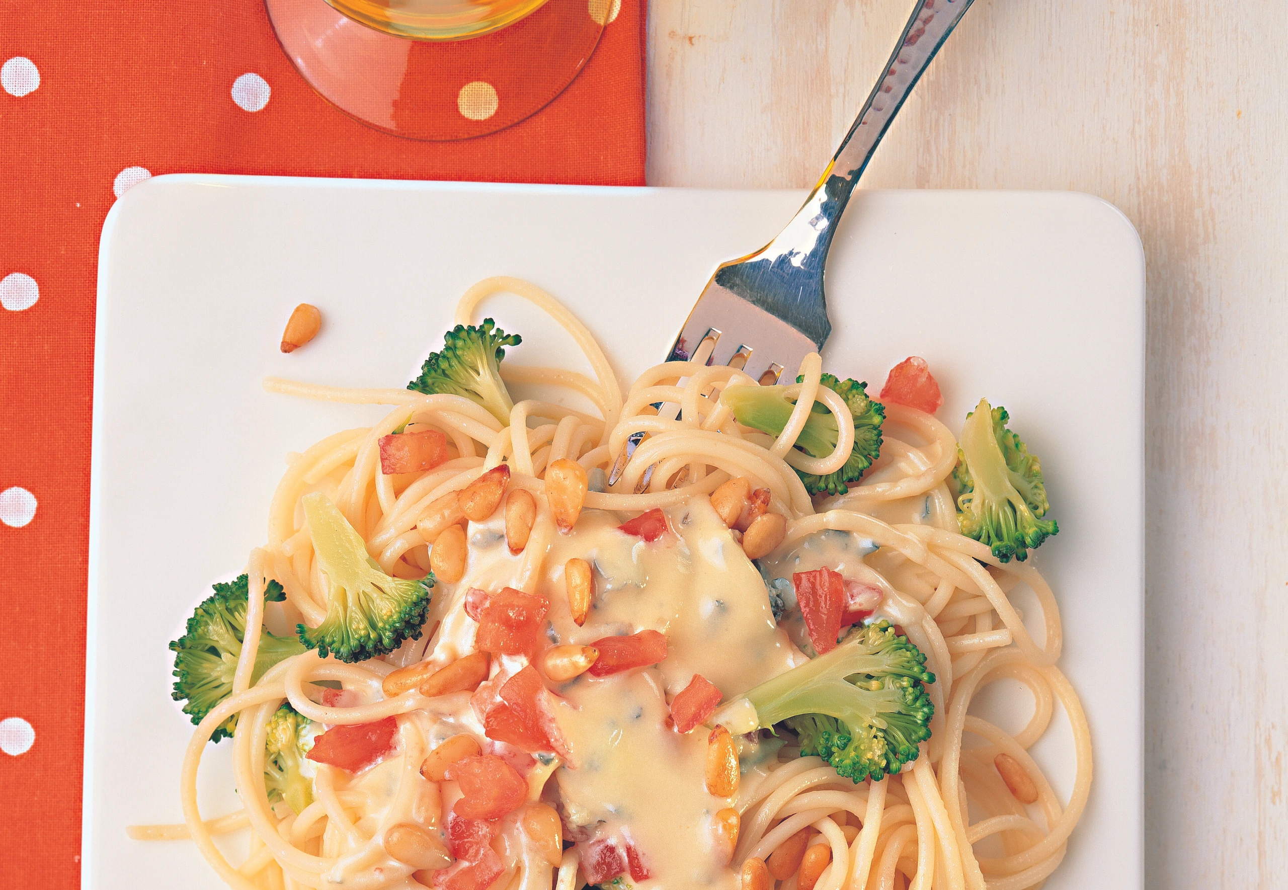 Spaghetti kurz abtropfen lassen, mit Käsesauce und Brokkoli vermischen. Mit Pfeffer abschmecken, mit Paradeiswürfeln und Pignoli bestreuen.