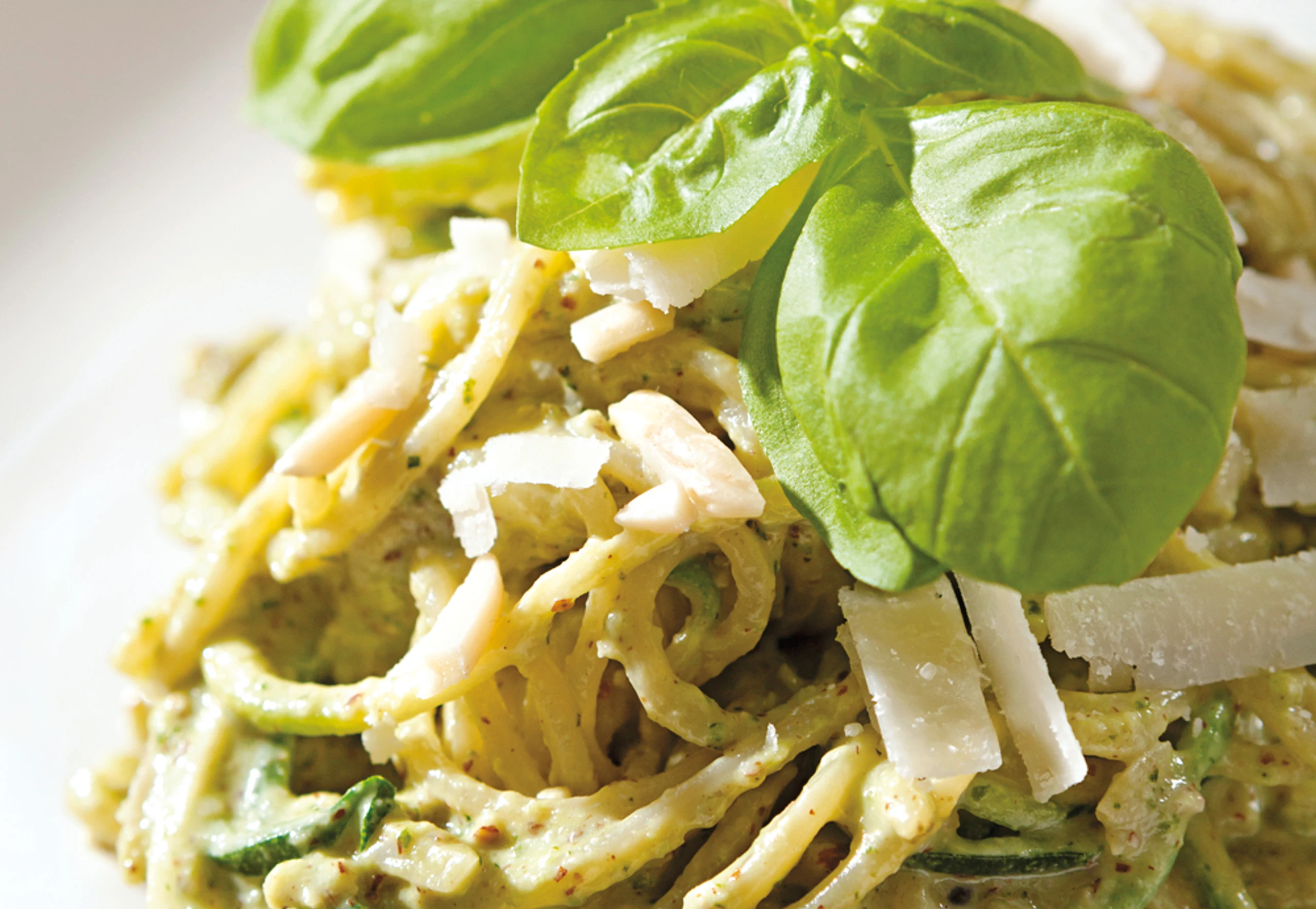 Spaghetti in Salzwasser al dente kochen. Währenddessen Zucchini mit einem Spiralschneider zu Gemüsespaghetti verarbeiten. Zucchininudeln mit der heißen, abgegossenen Pasta vermischen. Ziegenkäsepesto unterheben. Mit Parmesan bestreuen und eventuell mit frischen Basilikumblättern garnieren.