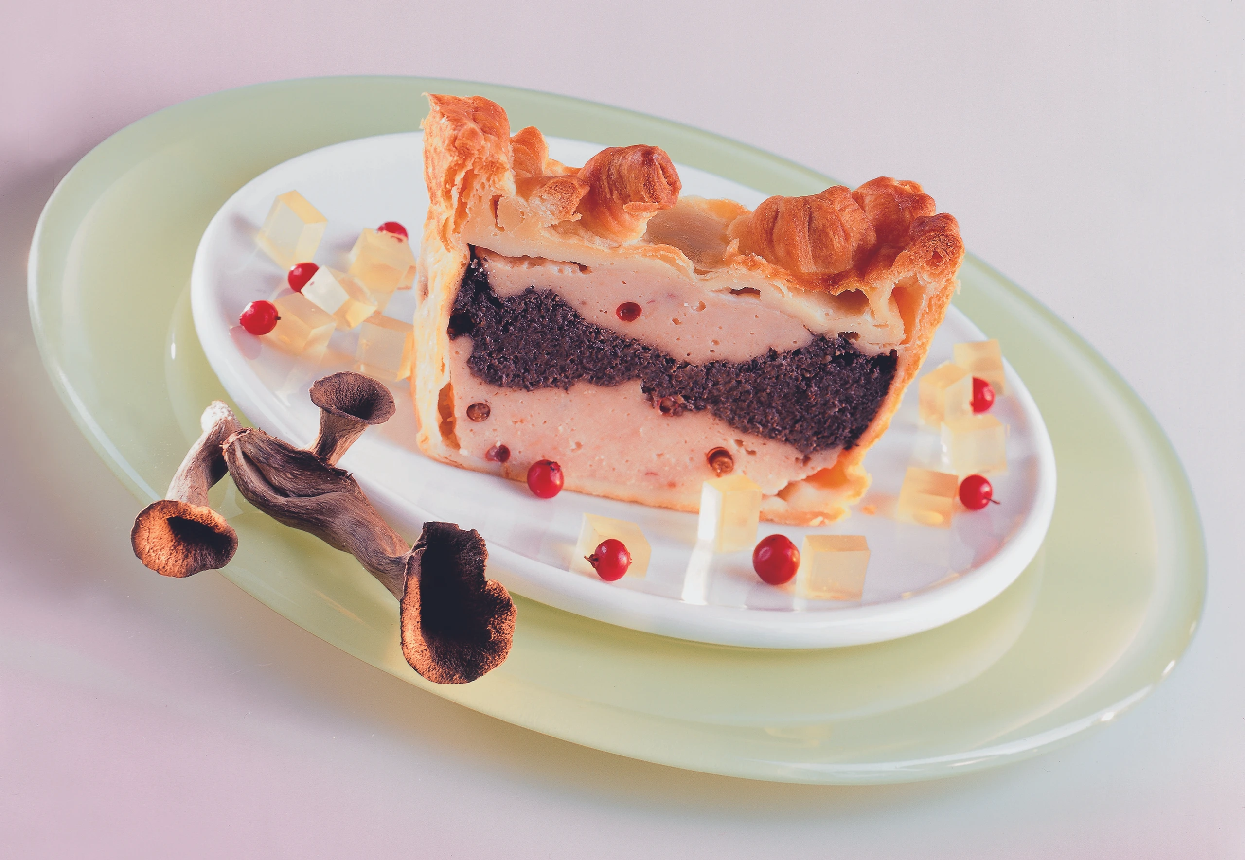 Die Hälfte vom Hühnermus einfüllen und verstreichen, die Pilzmischung gleichmäßig darauf verteilen, übriges Hühnermus glatt auf der Pilzmischung verstreichen. Seitliche Teigränder einschlagen, Teig an den Rändern behutsam festdrücken. Teig mit einer Gabel in kurzen Abständen einstechen und mit verquirltem Dotter bestreichen.10 Pastete im vorgeheizten Rohr (untere Schiene / Gitterrost) ca. 5 Minuten anbacken, Hitze auf 180 °C reduzieren, Pastete 45 Minuten fertig backen. Die Pastete kann man warm oder kalt servieren, mit Portweingelee-Würfeln und frischen Preiselbeeren garnieren.
