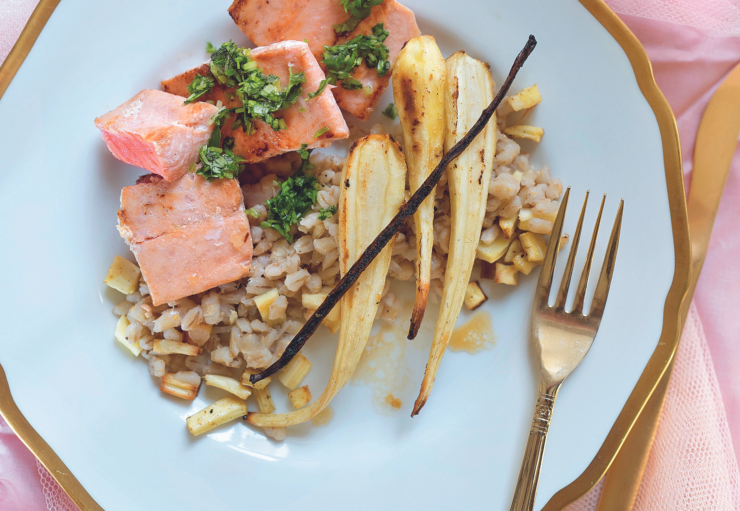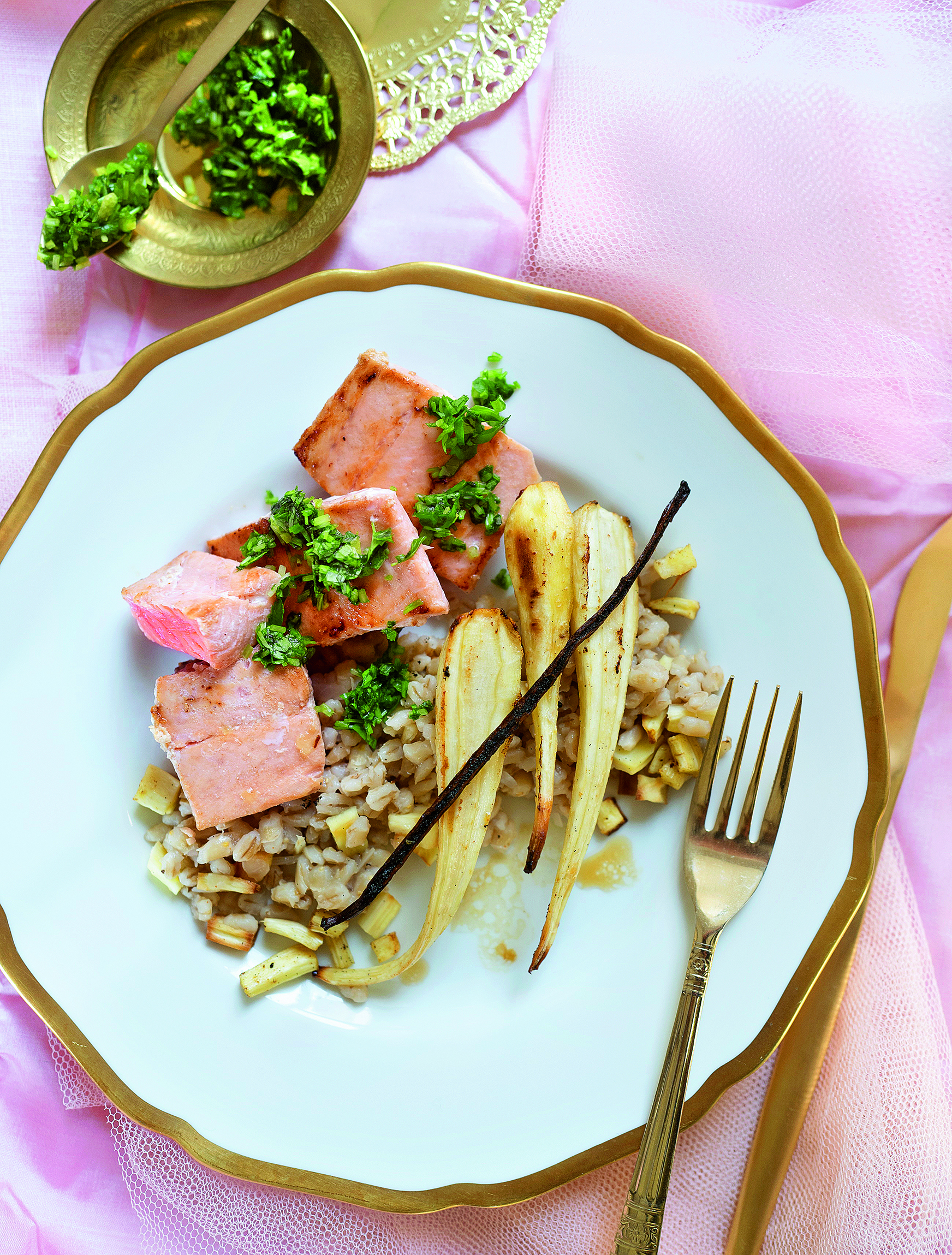 Pastinaken-Graupen mit halbierten Pastinaken und Lachs anrichten und mit Gremolata bestreuen.