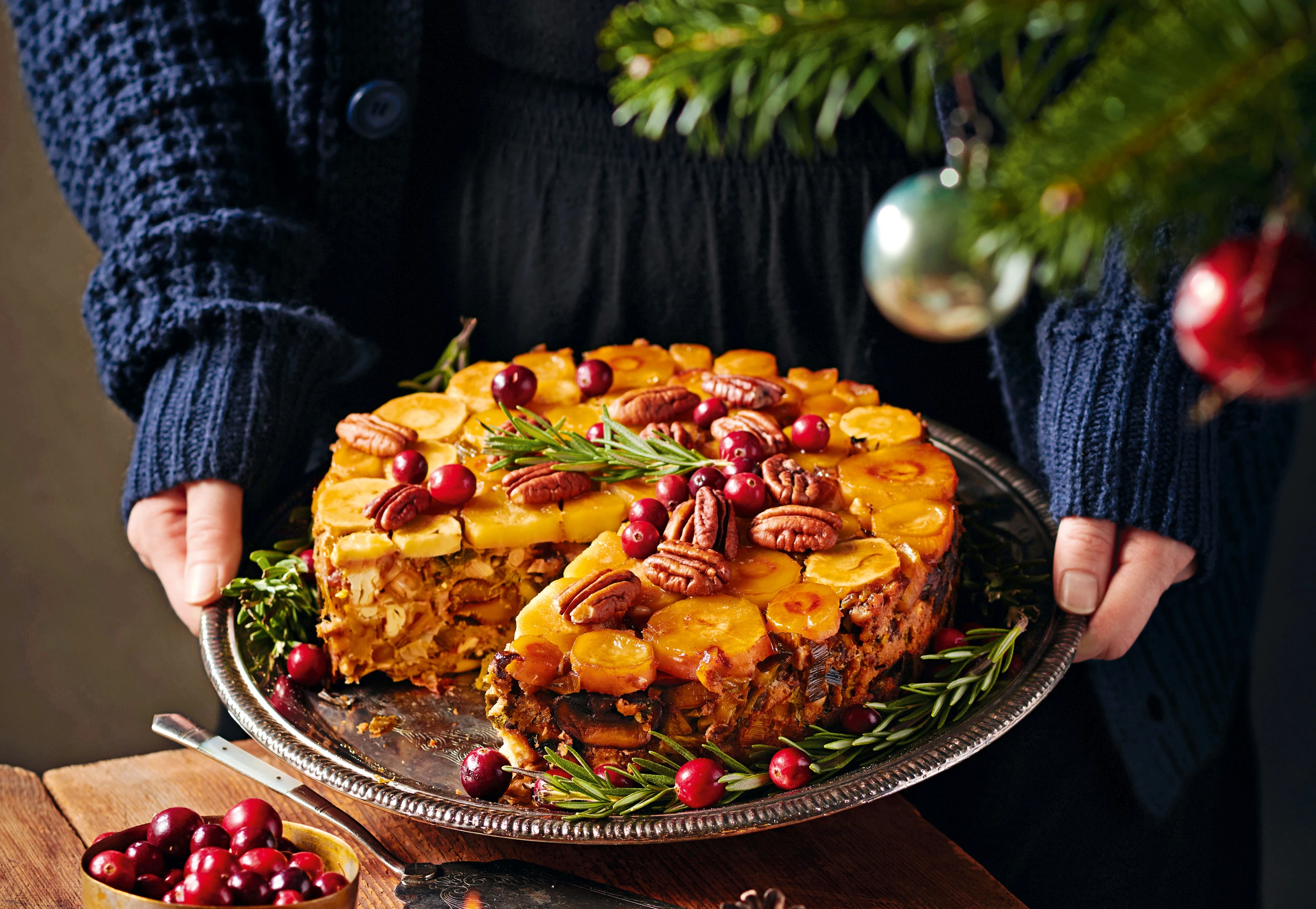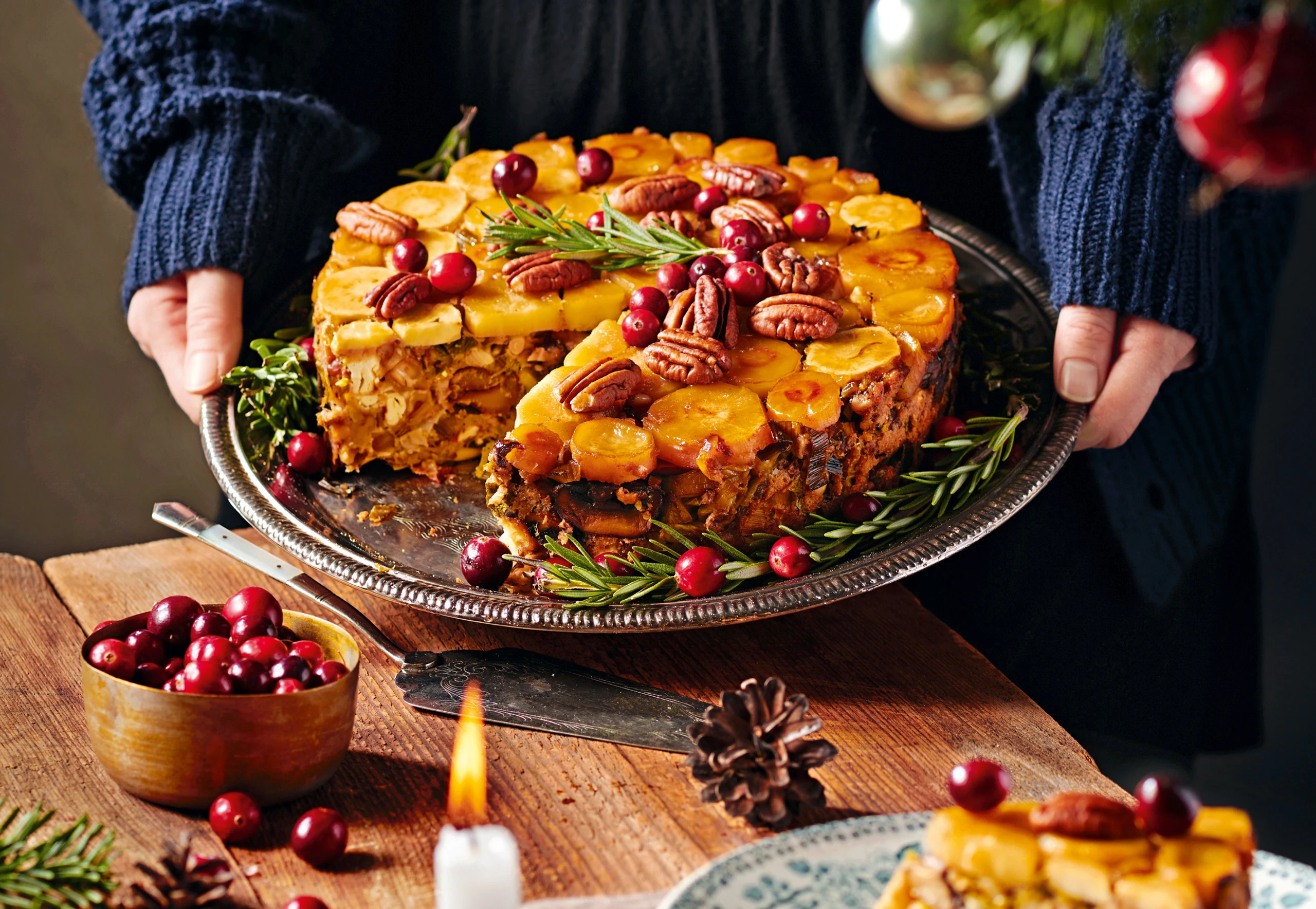 Im Rohr (Gitterrost / zweite Schiene von unten) ca. 50 Minuten backen. Herausnehmen und 10 Minuten überkühlen lassen. Kuchen aus der Form stürzen und mit Cranberries, Rosmarin und Nüssen garnieren.