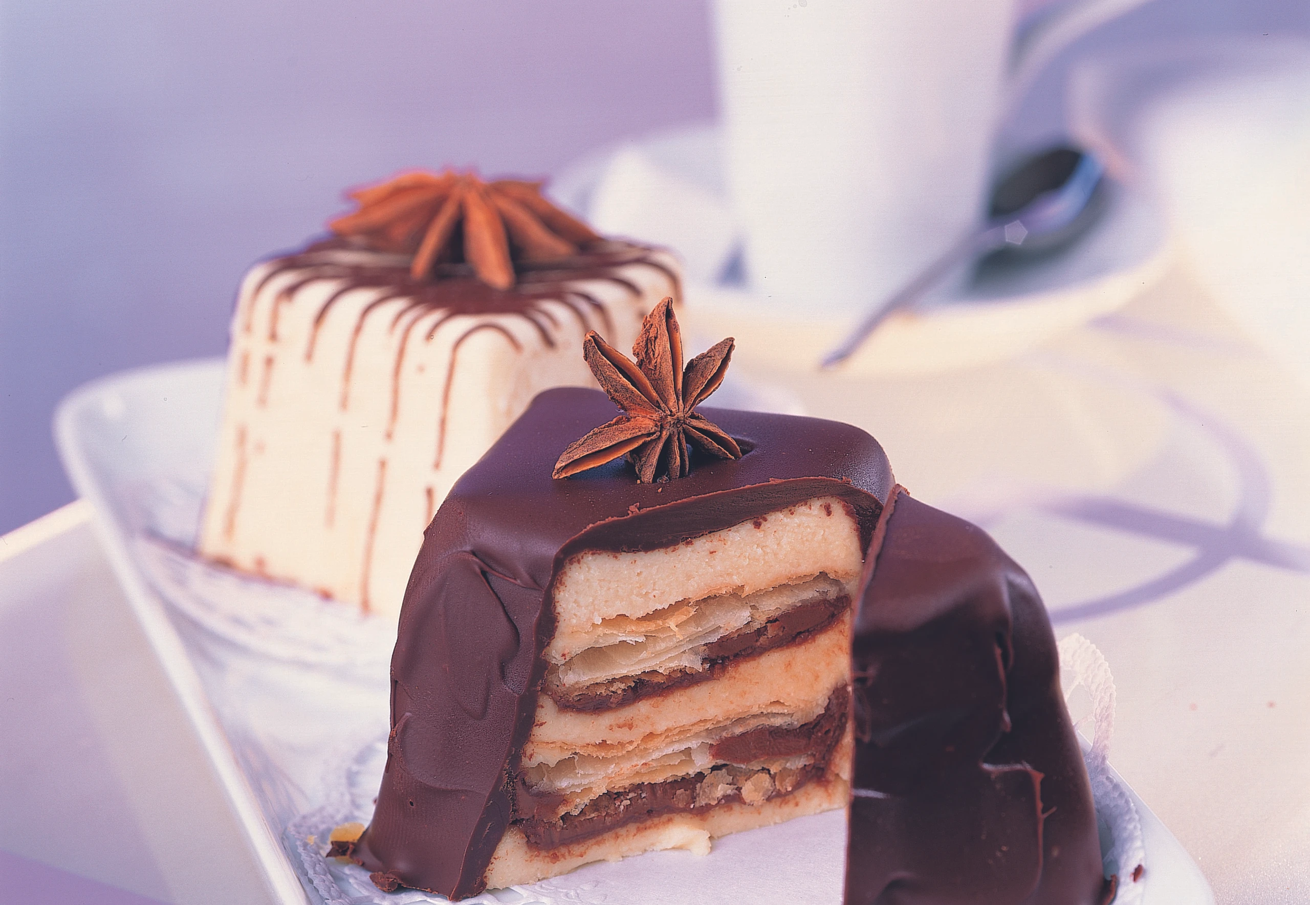 Förmchen kurz in heißes Wasser tauchen, Pralinen herausstürzen und auf ein Gitter legen. Kuvertüren getrennt im Wasserbad (ca. 37 °C) schmelzen. 2 EL dunkle Kuvertüre in ein kleines Stanitzel füllen. Pralinen mit dunkler und heller Kuvertüre überziehen. Die hellen Pralinen mit dunkler Kuvertüre verzieren. Die Pralinen mit Sternanis dekorieren.