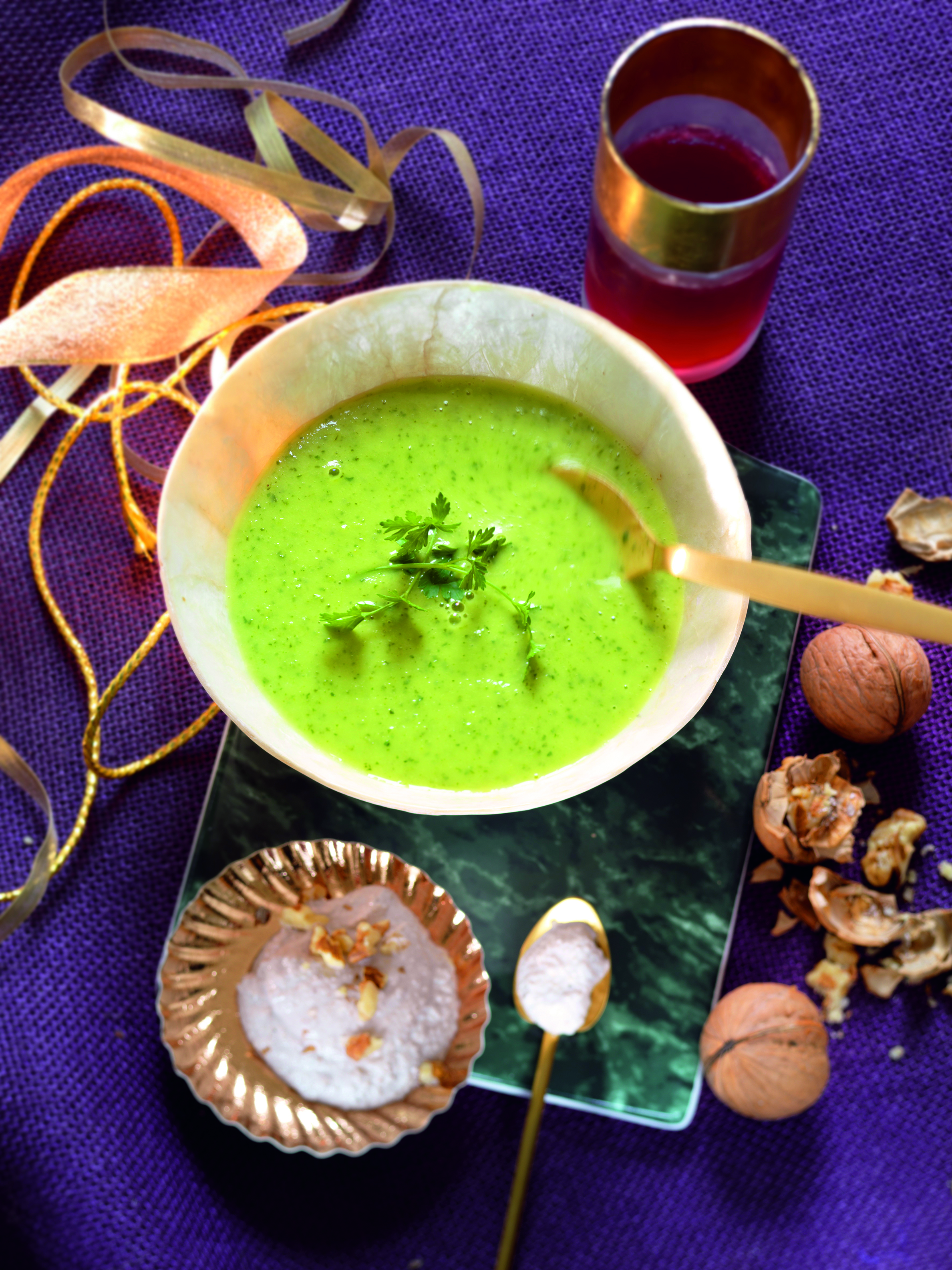 Gemüsesuppe mit Öl, Zitronenschale und Muskat aufkochen. Pastinake, Petersilwurzel, Knoblauch und Petersilstängel zugeben. Suppe zugedeckt 20 Minuten köcheln. Petersilblätter zugeben. Suppe mit dem Stabmixer fein pürieren, mit Salz, Pfeffer und Muskat abschmecken. Mit dem Walnuss-Dip servieren.