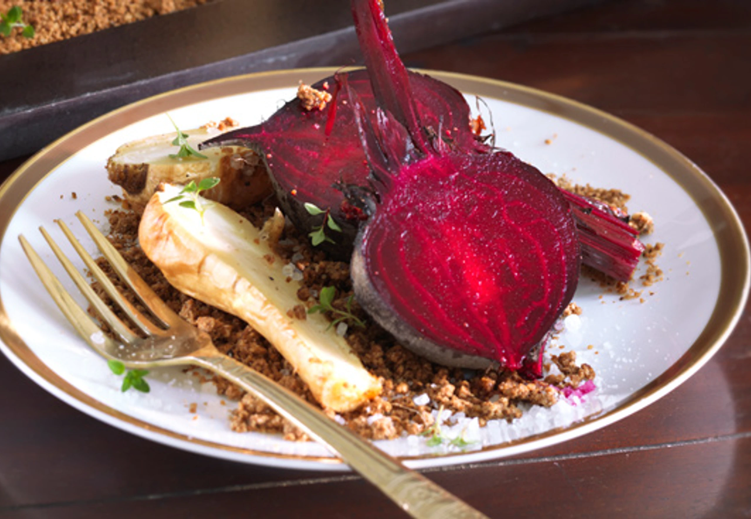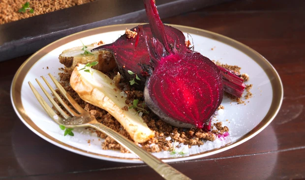 - Pastinaken und Rote Rüben unter fließendem Wasser gut bürsten, in einen Bräter legen, mit Meersalz und Pfeffer würzen, mit 4 EL Olivenöl beträufeln und im Rohr (untere Schiene / Gitterrost) weich garen (ca. 90 Minuten).