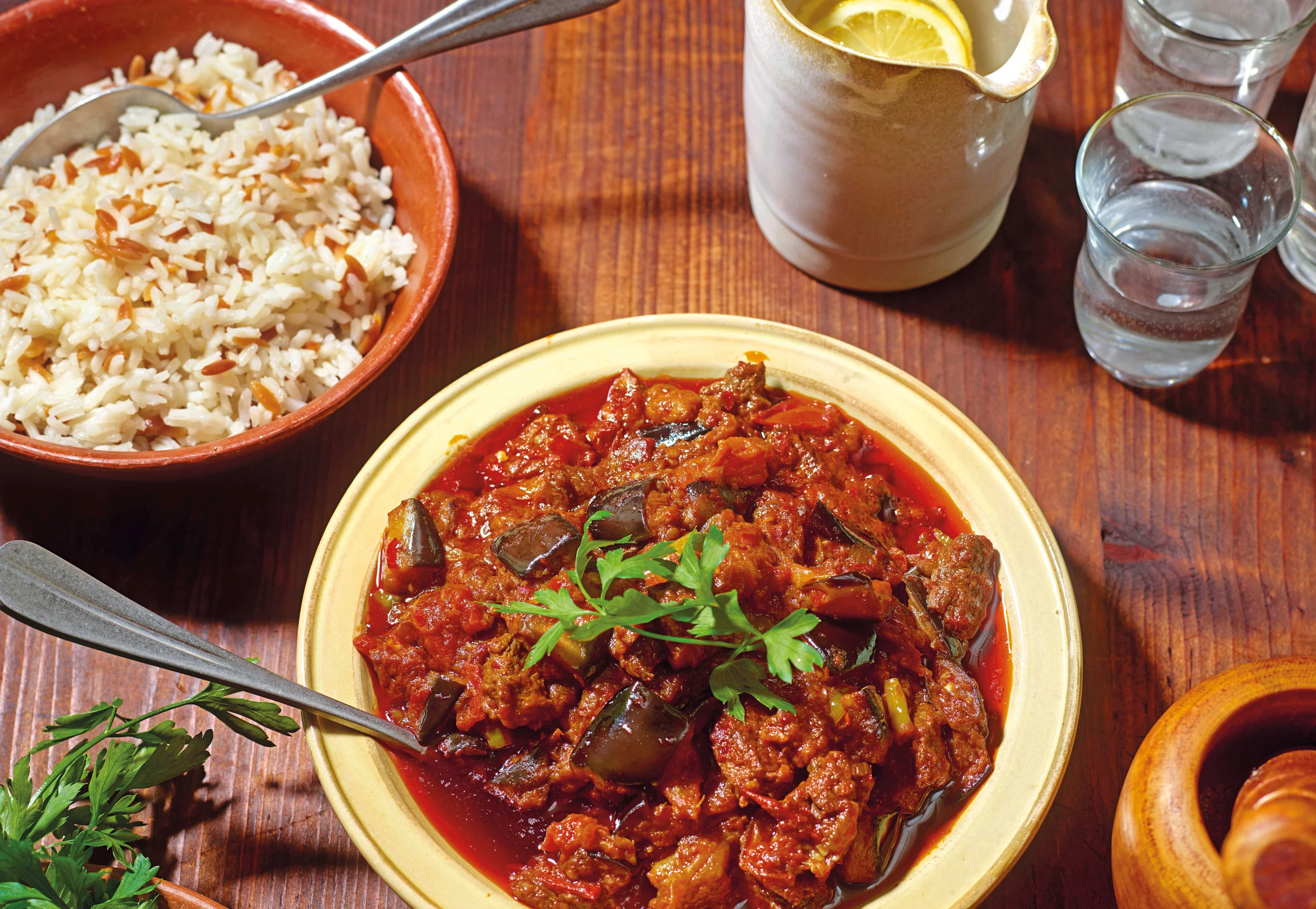 Reis und Butter zugeben und 1 bis 2 Minuten mitrösten. Mit Wasser aufgießen, Salz unterrühren und mit geschlossenem Deckel bei geringer Hitze ca. 20 Minuten garen. Reis vom Herd nehmen und für 10 Minuten ziehen lassen. Eintopf mit Reis servieren.