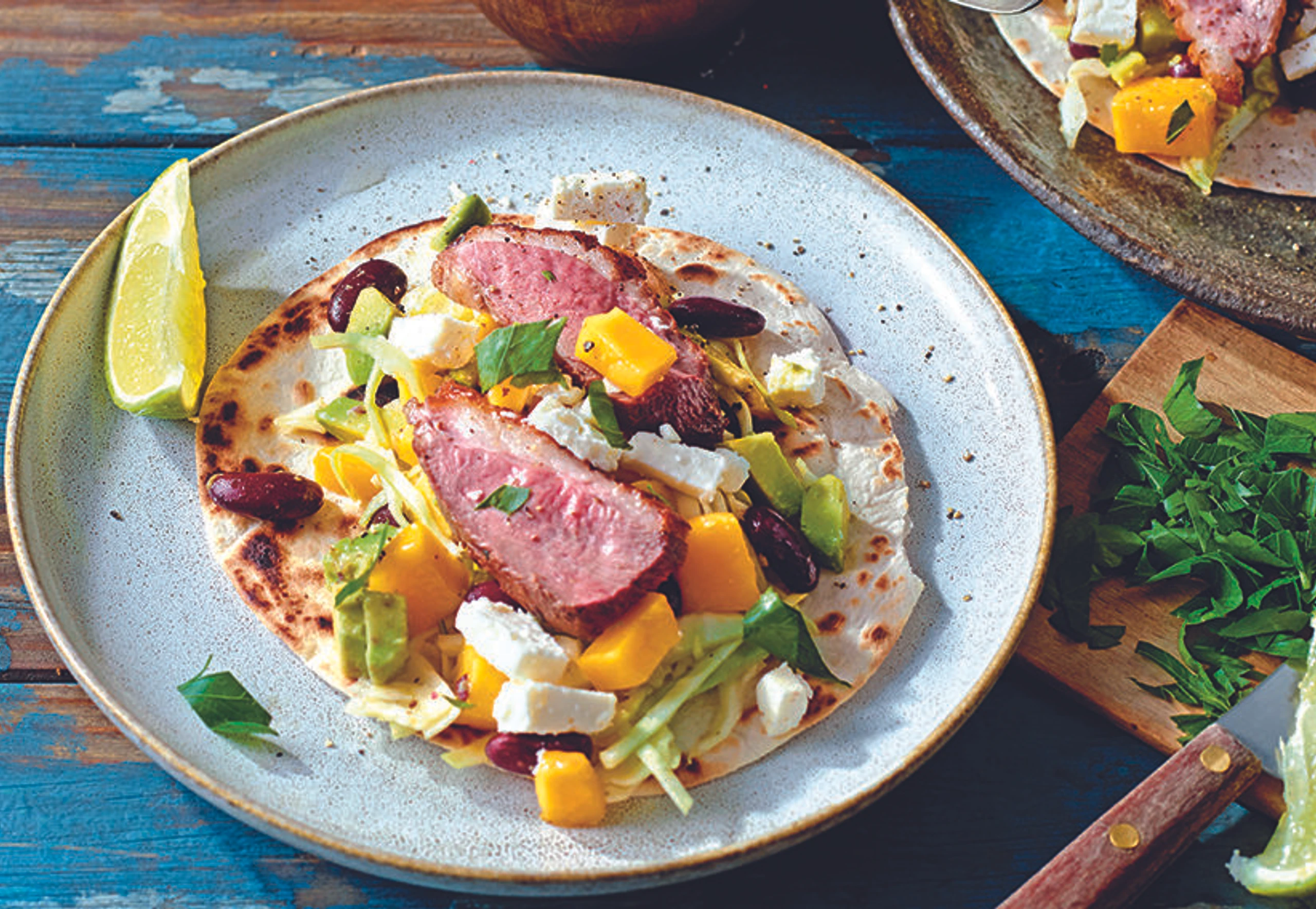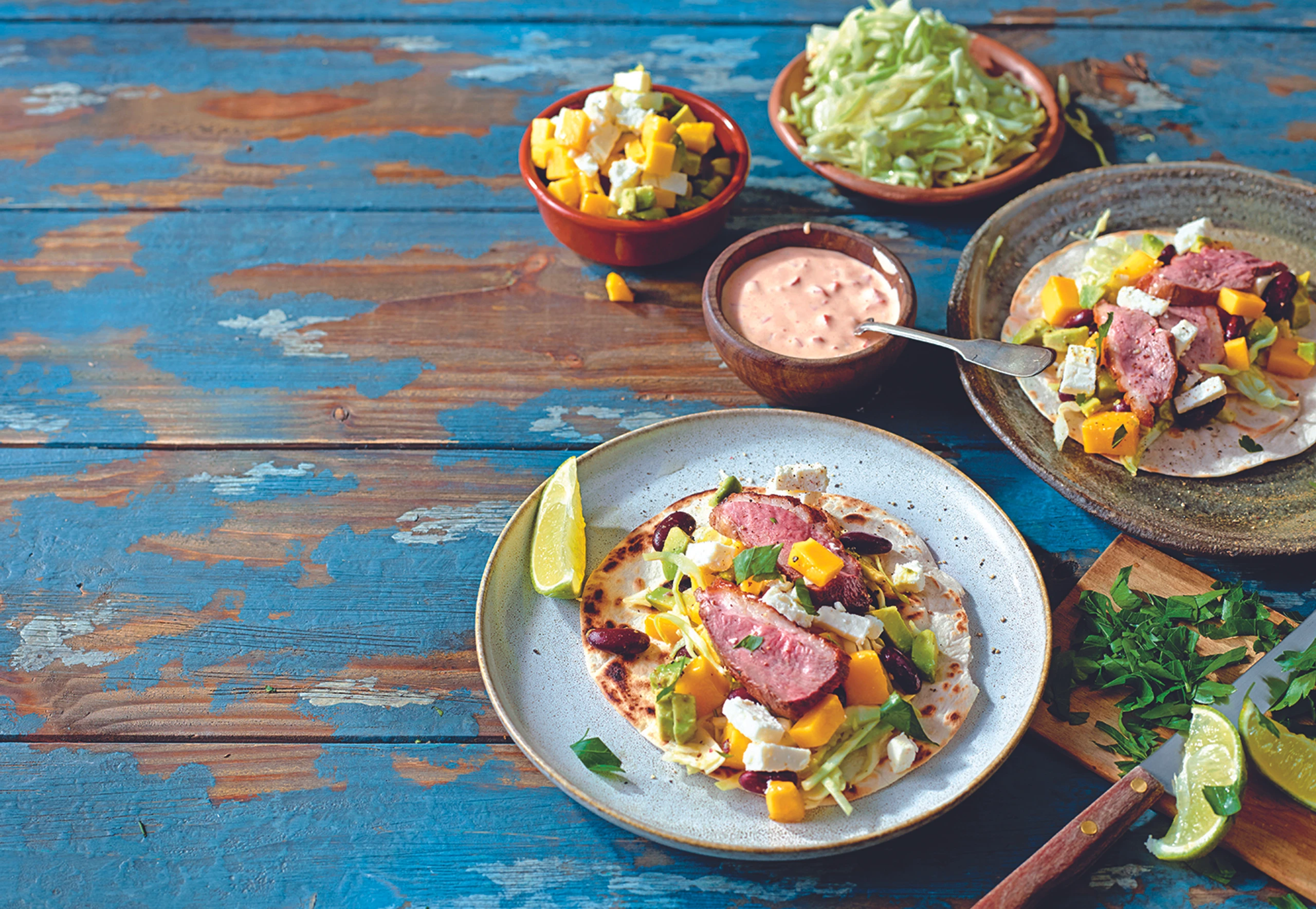 Tortillas laut Anweisung auf der Packung erwärmen. Entenbrust quer in dünne Scheiben schneiden. Tortillas mit Kraut, Entenbrust, Avocado, Bohnen, Mango und Feta füllen. Mit der Sauce servieren und eventuell mit Limettenspalten garnieren.