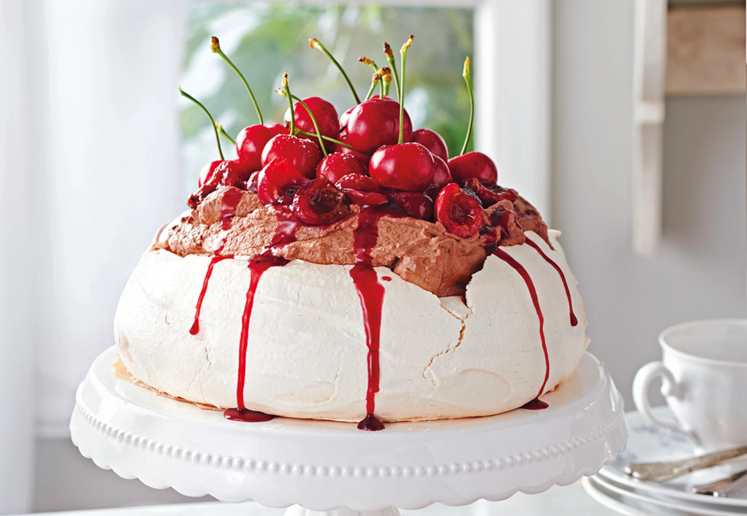 Obers, Zucker und Kakao cremig schlagen und vorsichtig auf der Pavlova verstreichen. Kirschkompott auf der Creme verteilen und übrige Kirschen darauf setzen.