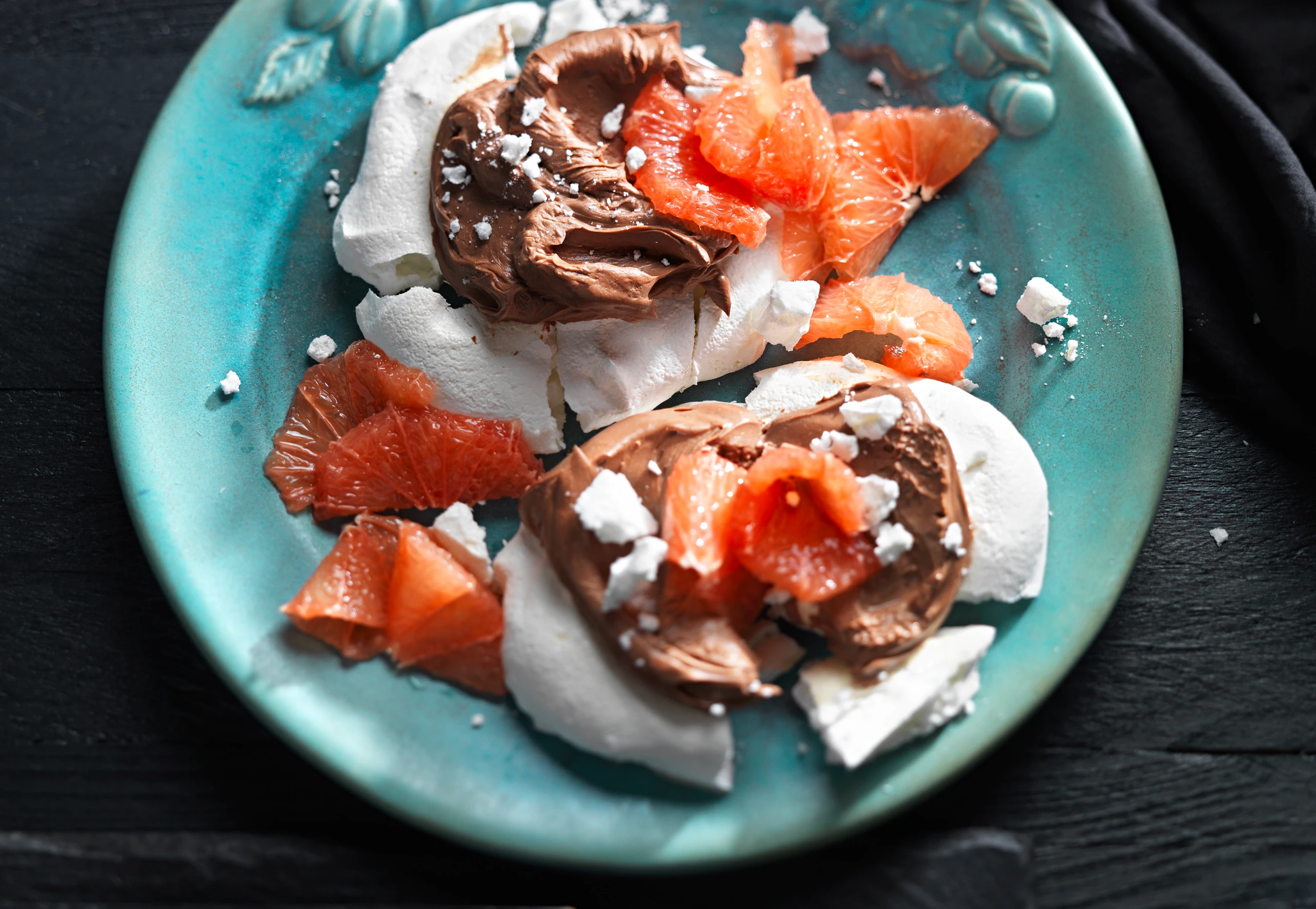 Ganache aus dem Kühlschrank nehmen und akklimatisieren lassen. Grapefruits so schälen, dass auch die weiße Innenhaut entfernt wird. Fruchtfleisch längs halbieren und quer in Scheiben schneiden. Pavlova mit Ganache und Grapefruitscheiben anrichten.