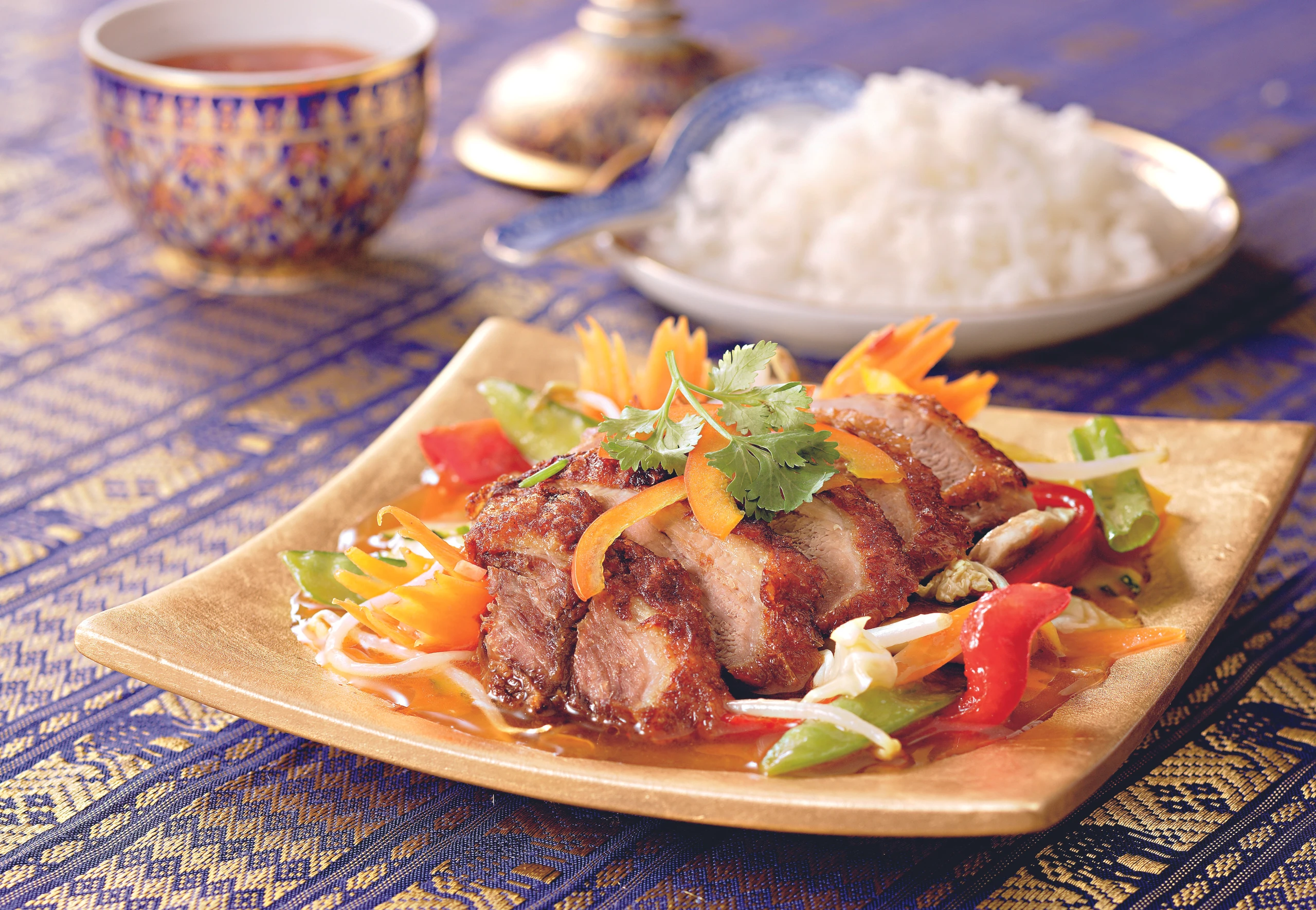 Gemüse mit den Entenstreifen anrichten, mit Koriander garnieren und mit dem Jasminreis servieren.
