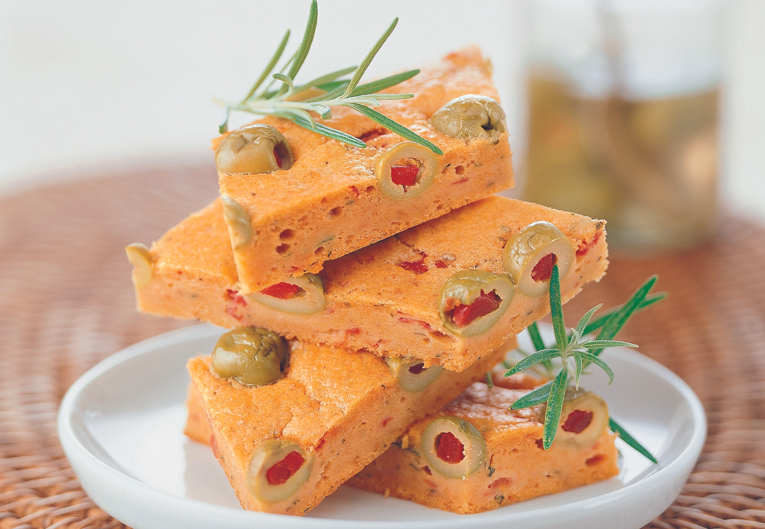 Eiklar zu cremigem Schnee schlagen und abwechselnd mit dem Mehl unter den Butterabtrieb heben. Masse auf dem Blech verstreichen, mit den Oliven belegen und im Rohr ca. 30 Minuten backen.