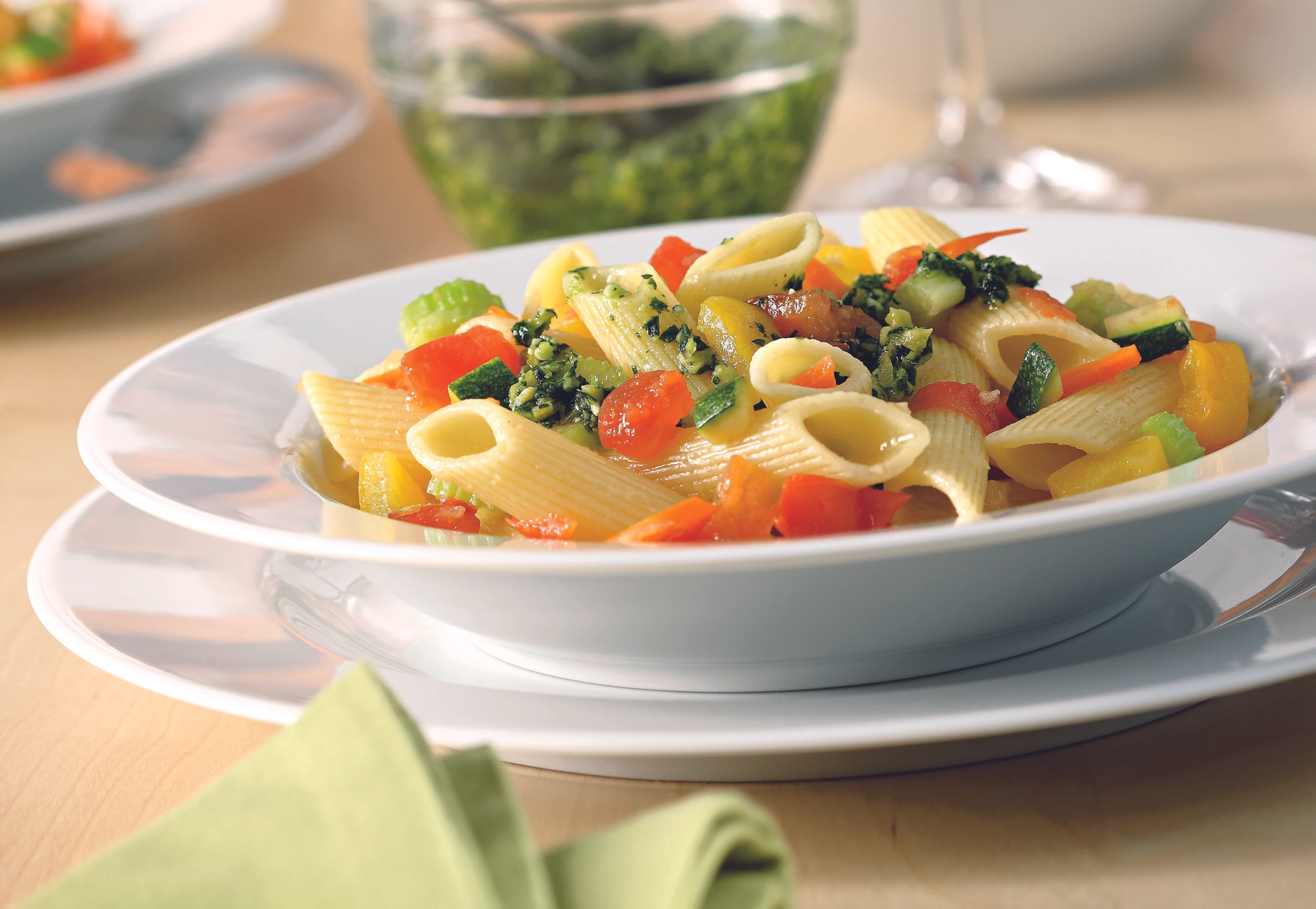 Penne mit Fünf Gemüse Potpurri und Oliven Pesto