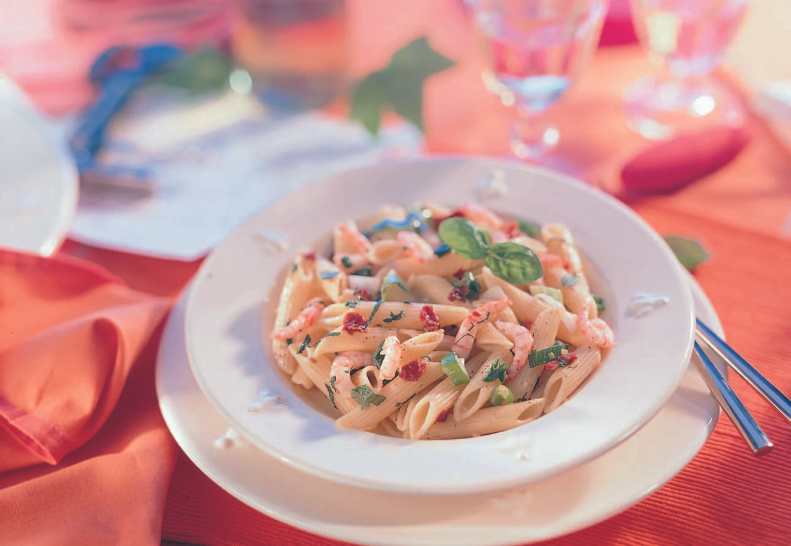 Penne abseihen. Öl in einer Pfanne erhitzen. Jungzwiebel und Knoblauch kurz anschwitzen, Shrimps, Paradeiser und Basilikum zugeben und kurz mit erhitzen. Penne untermischen, mit Salz und Pfeffer würzen und in vorgewärmten Tellern anrichten.