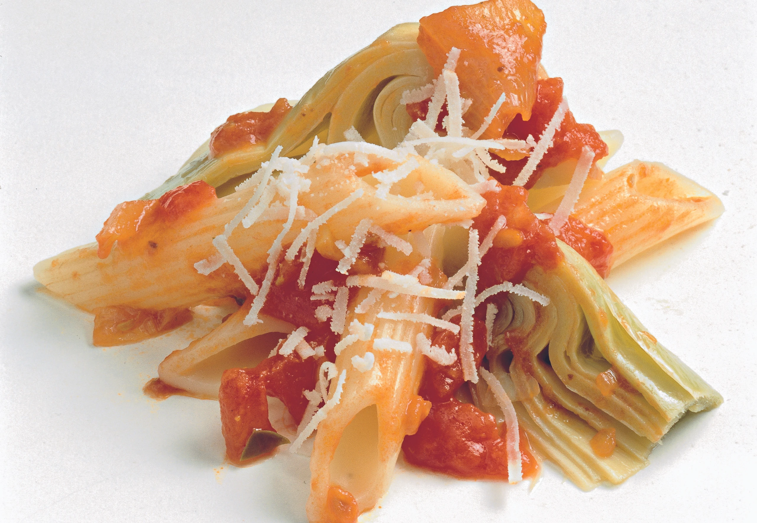 Paradeiser abseihen, Saft auffangen. Paradeiser in kleine Stücke schneiden. Artischockenherzen abtropfen lassen und in kleine Stücke schneiden. Zwiebel schälen, kleinwürfelig schneiden und in Öl anschwitzen. Artischocken, Kapern und die Paradeiserstücke zugeben. Paradeissaft und Suppe zugießen und die Sauce auf kleiner Flamme ca. 1/2 Stunde köcheln. Penne in Salzwasser bissfest kochen, abseihen, abtropfen lassen und mit der Sauce vermischen. Nudeln mit Parmesan bestreut servieren.