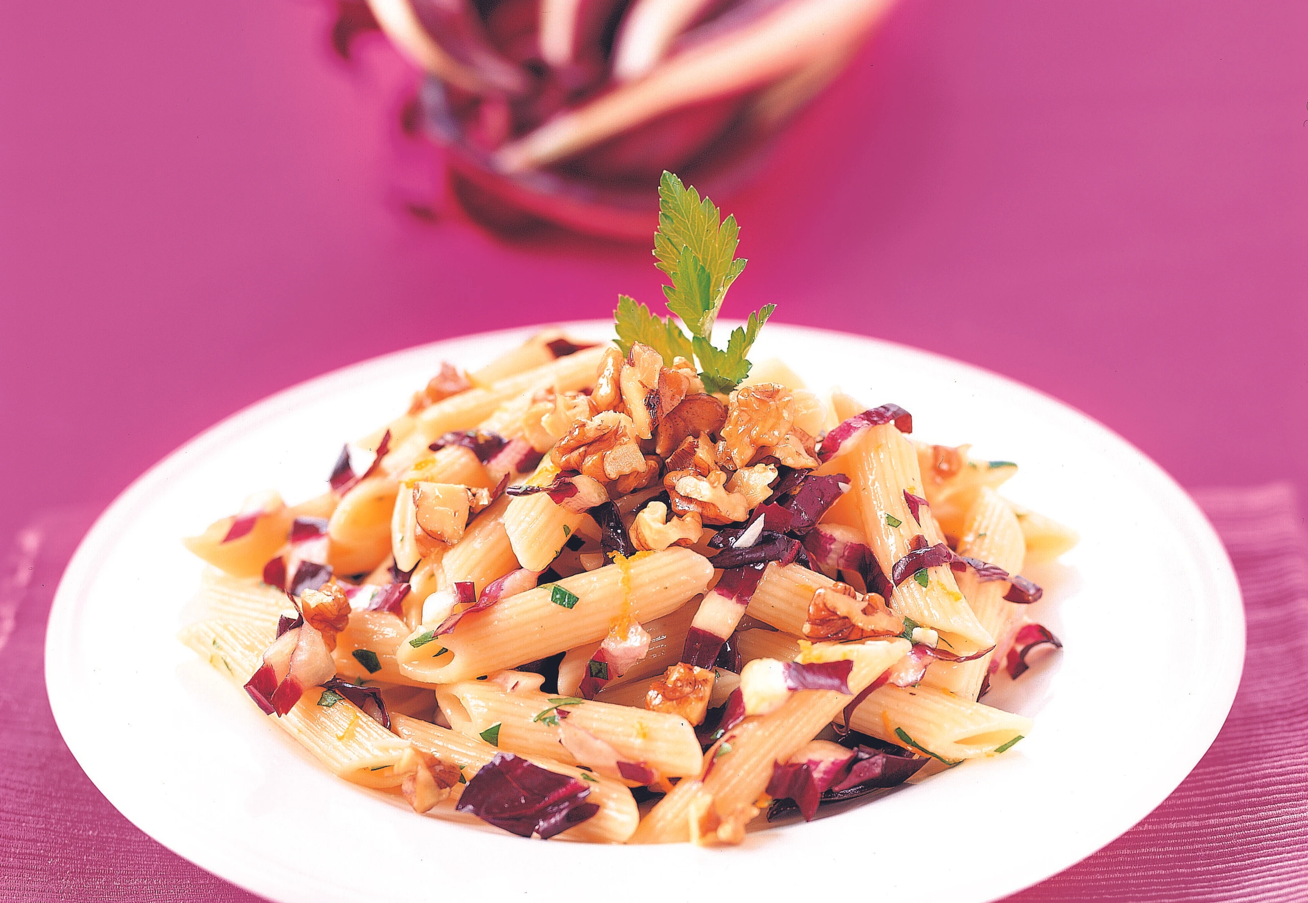 Radicchio längs halbieren und quer in 1/2 cm dicke Streifen schneiden. Penne, Radicchio und Petersilie in die Sauce rühren, salzen, pfeffern und kurz ziehen lassen. Pasta mit Nüssen bestreut servieren.
