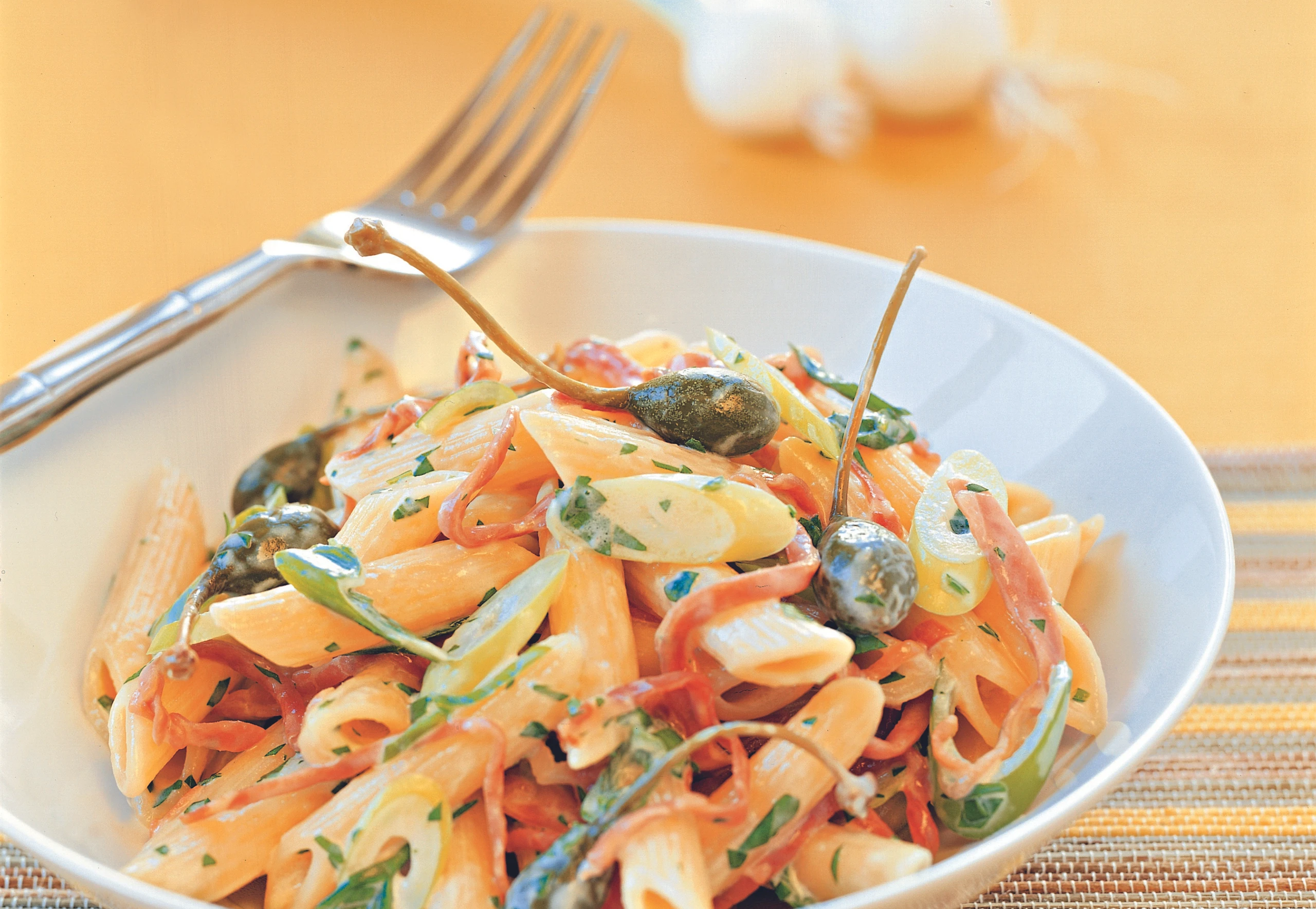 Penne in reichlich Salzwasser bissfest kochen, abseihen und abtropfen lassen. Jungzwiebel im Öl anschwitzen, Penne untermischen. Eimischung unterrühren, Penne kurz ziehen lassen. Schinken, Petersilie, Kapern und Parmesan einrühren. Penne unter Rühren nochmals erhitzen und anrichten.