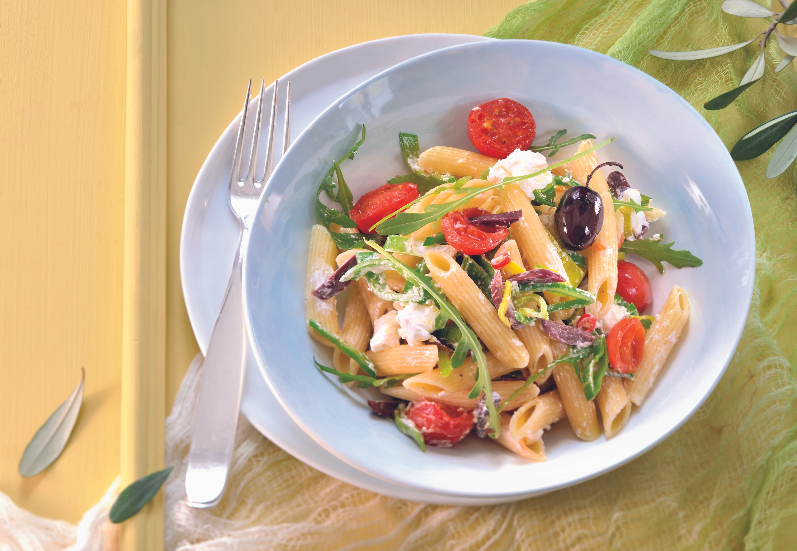 Lauch in 2 EL Öl hell anschwitzen, Paradeiser zugeben und unter Rühren anrösten. Penne zugeben und kurz mitrösten. Rucola, Oliven, Käse und Chili unterrühren. Pasta mit Salz und Pfeffer würzen.