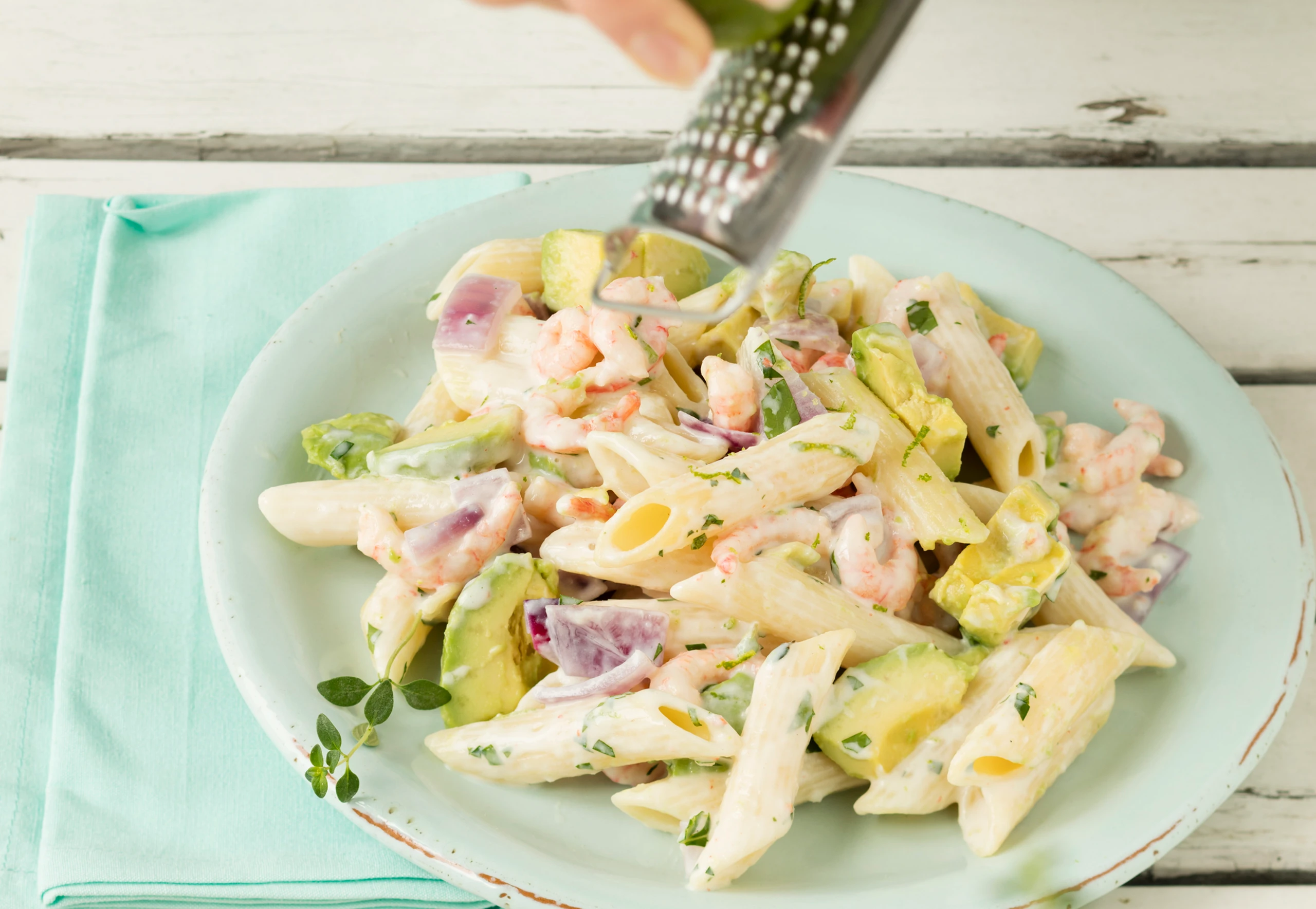 Penne in reichlich Salzwasser bissfest kochen, abseihen, abtropfen lassen, mit der Sauce vermengen. Pasta anrichten und mit Limettenschale bestreut servieren.