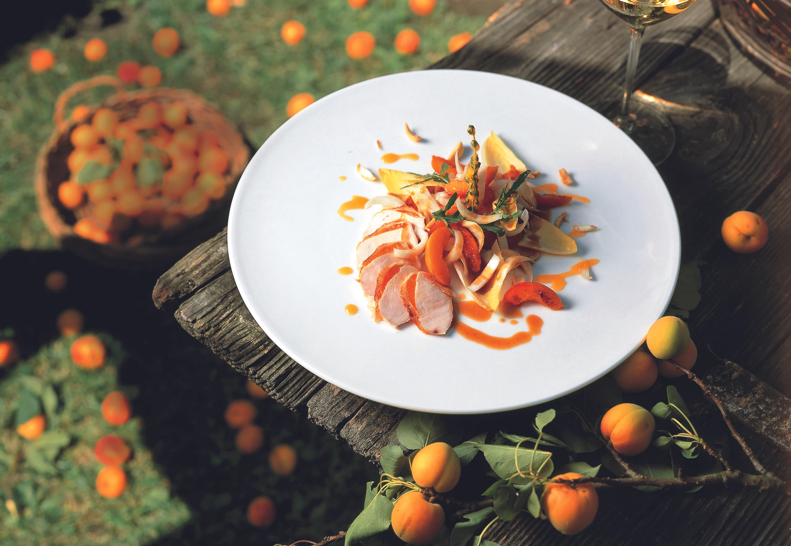 Perlhuhnbrüstchen mit Marillen auf Chicorée-Mandelsalat