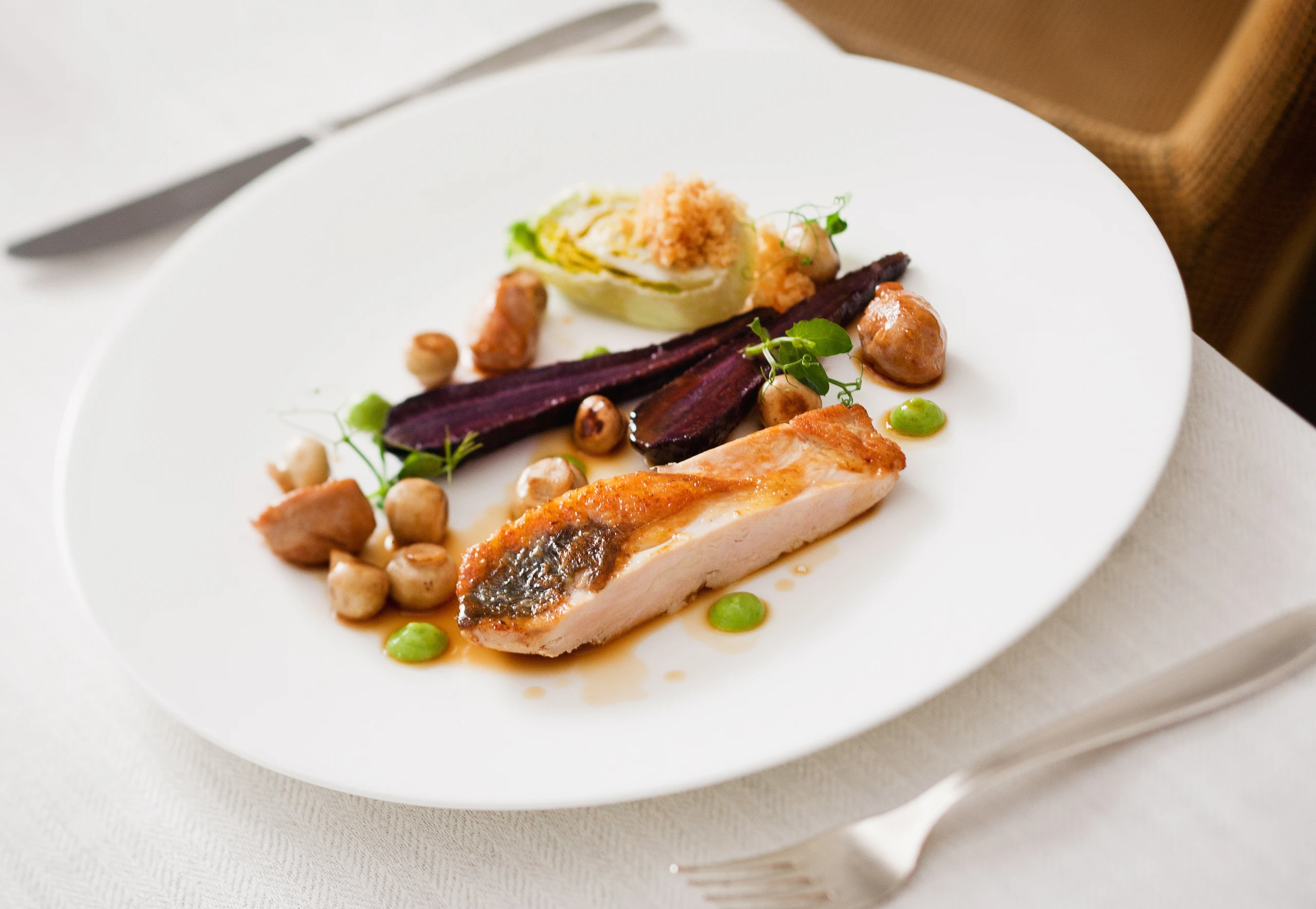Perlhuhnbrüste über Dampf ca. 12 Minuten garen, auswickeln und im Öl auf der Hautseite knusprig anbraten. Hühneraustern einlegen und rundum mitbraten. Perlhuhnbrüste wenden und fertig braten. Jus und Karotten erwärmen.