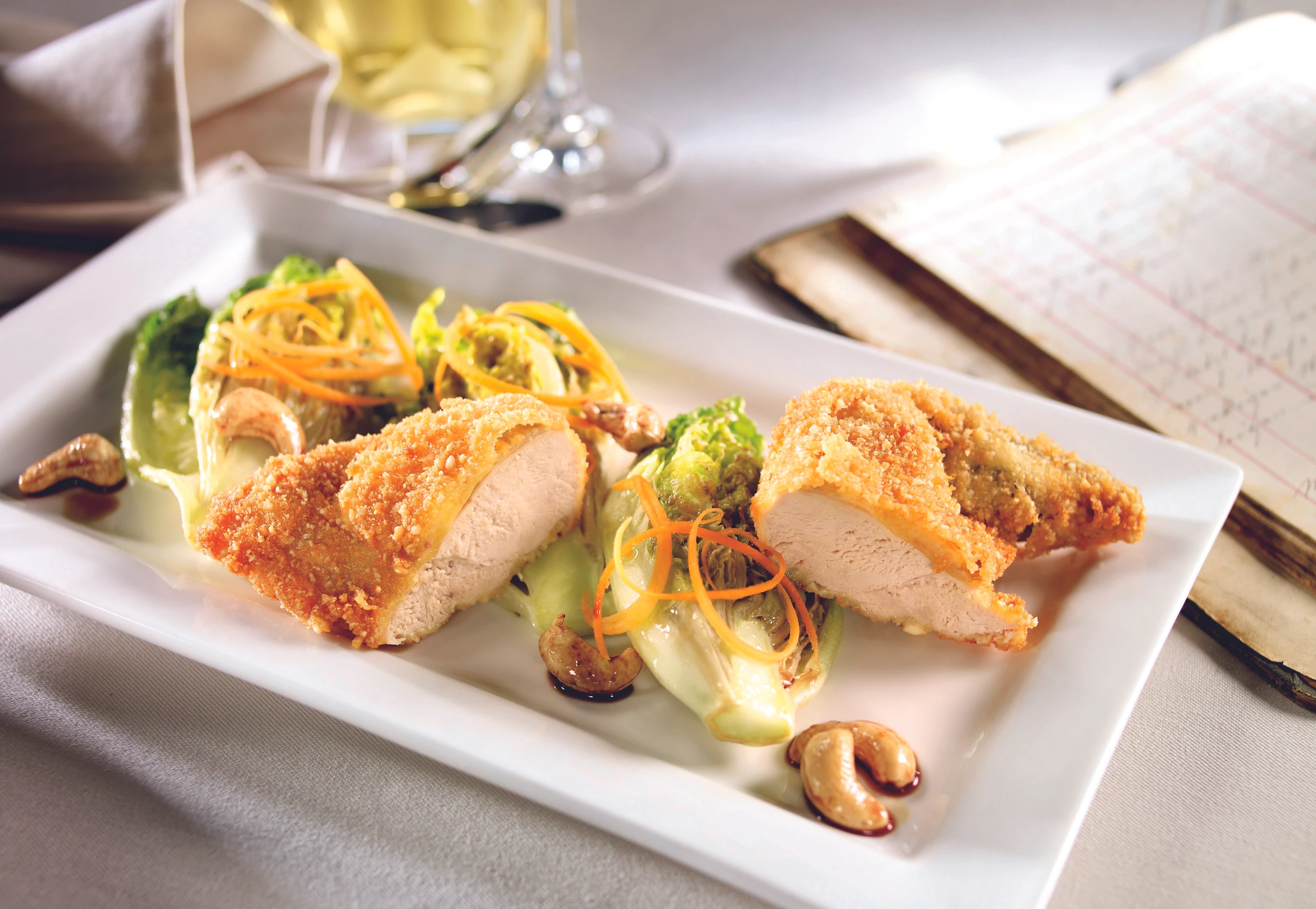 Hühnerbrüste salzen und pfeffern, in Mehl, dann in den Eiern wenden. Toastbrot mit Cashews vermischen, Hühnerbrüste darin panieren.