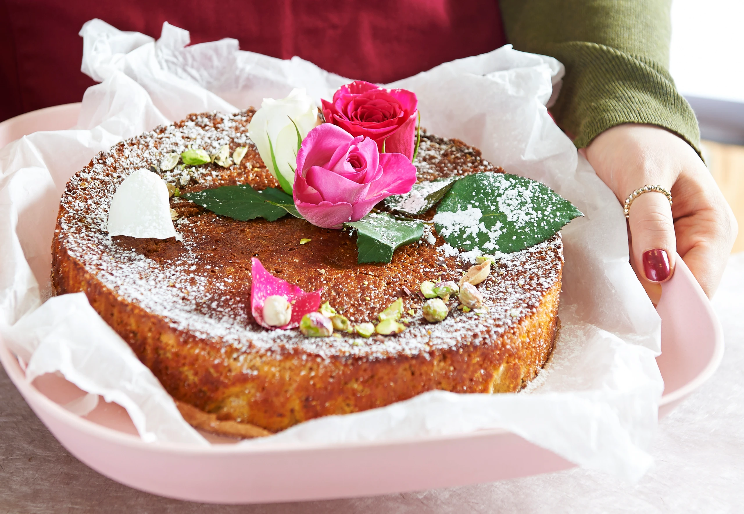 Kuchen aus dem Rohr nehmen, ca. 15 Minuten abkühlen lassen und aus der Form lösen. Den noch warmen Kuchen mit dem Sirup rundum einstreichen und mit Rosenblüten, Rosenblättern und Pistazien garnieren, mit Staubzucker bestreuen.