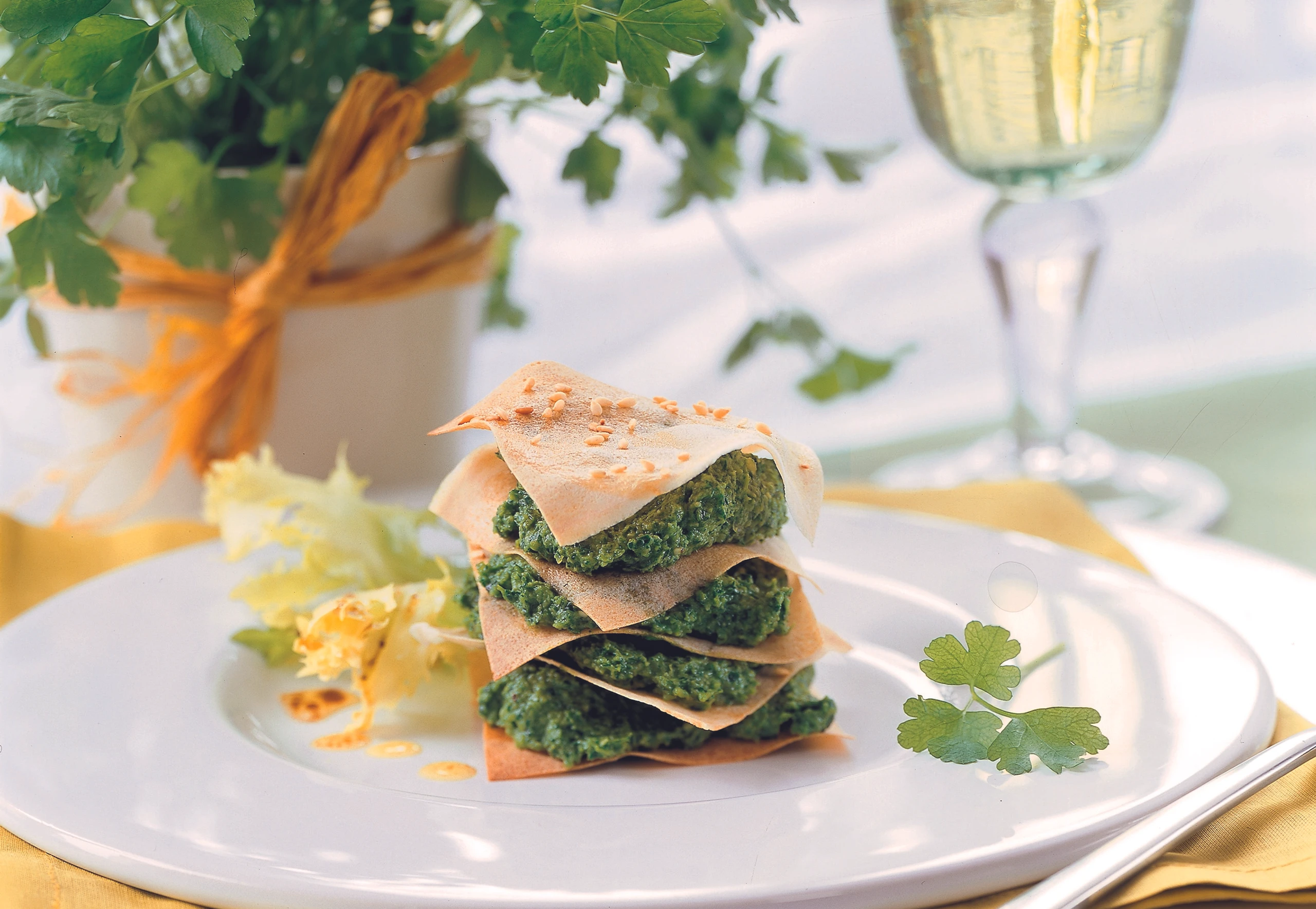Sechzehn Teigblätter mit Mus bestreichen, je 4 übereinander setzen, mit 4 Blättern abdecken. Salat marinieren und mit den Türmchen servieren.