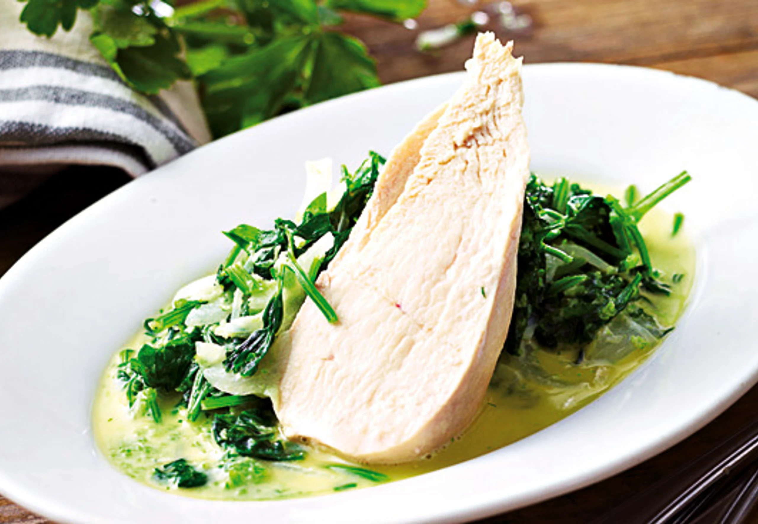 - Hühnerfilet portionieren und mit dem Spinat servieren.