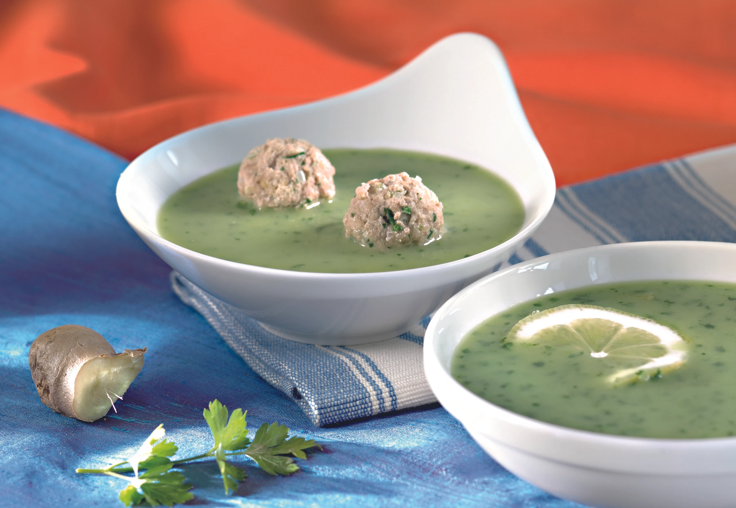 Suppe vom Herd nehmen, restliche Petersilie zugeben. Suppe mit dem Mixstab kurz pürieren. Fleischbällchensuppe mit der Petersilsuppe vermischen, evtl. mit Zitronensaft abschmecken.