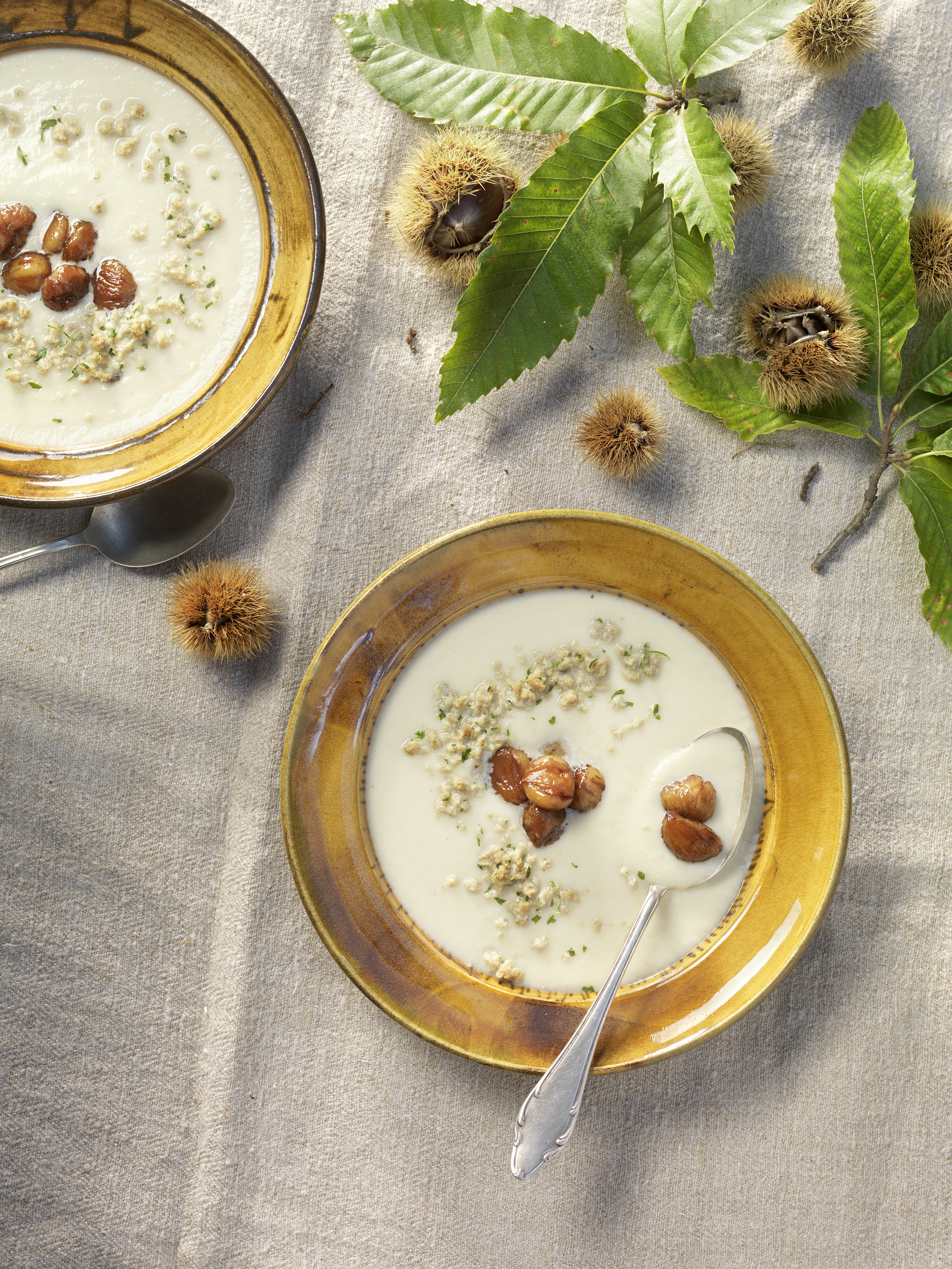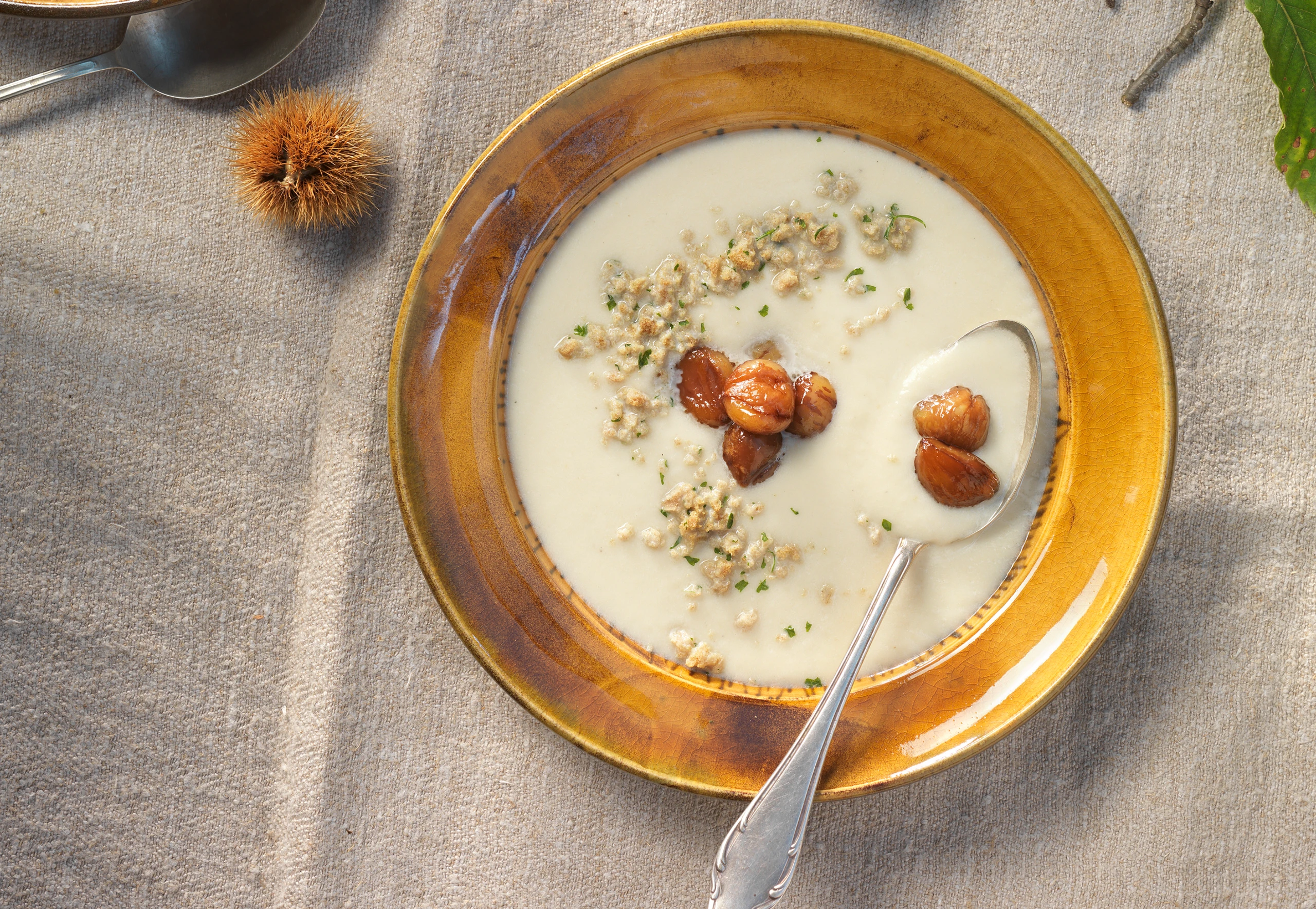 Suppe mit Maroni und Petersilbröseln servieren.