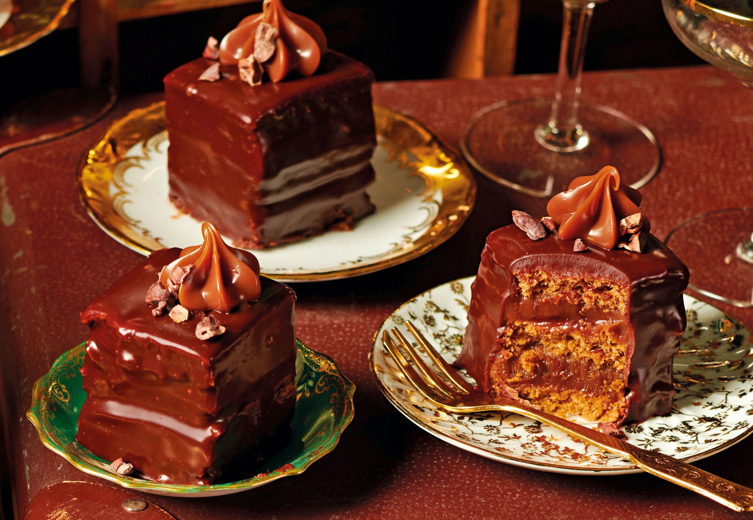 Schnitte in 20 Würfel schneiden, in die Glasur tunken, abtropfen lassen und auf einem Gitterrost trocknen lassen. Petit Fours mit übriger Ganache und Kakaonibs verzieren.
