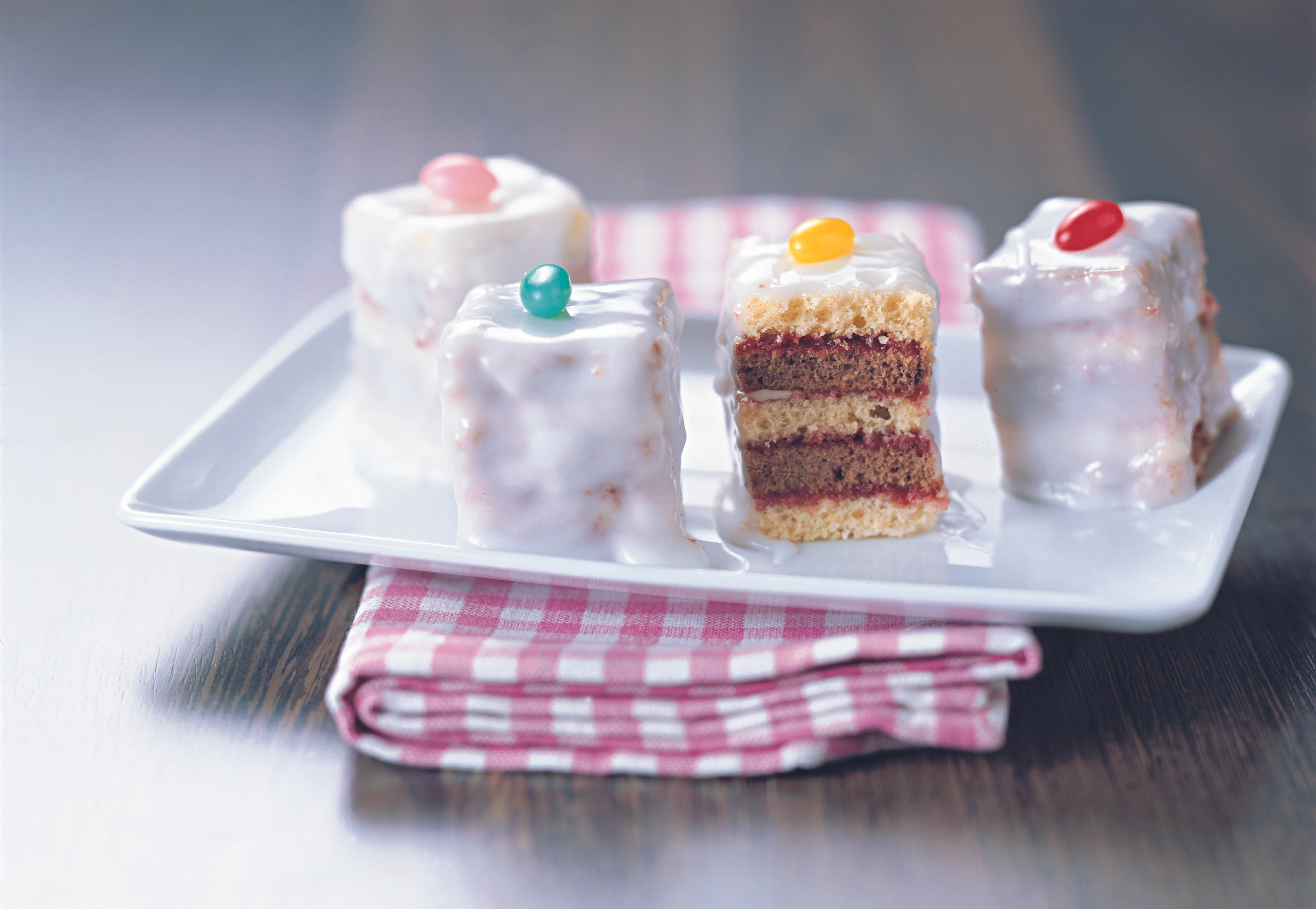 Biskuit in Würfel schneiden. Zitronensaft mit Staubzucker glatt rühren, die Würfel damit überziehen, Gelee-Eier darauf setzen. Glasur fest werden lassen.